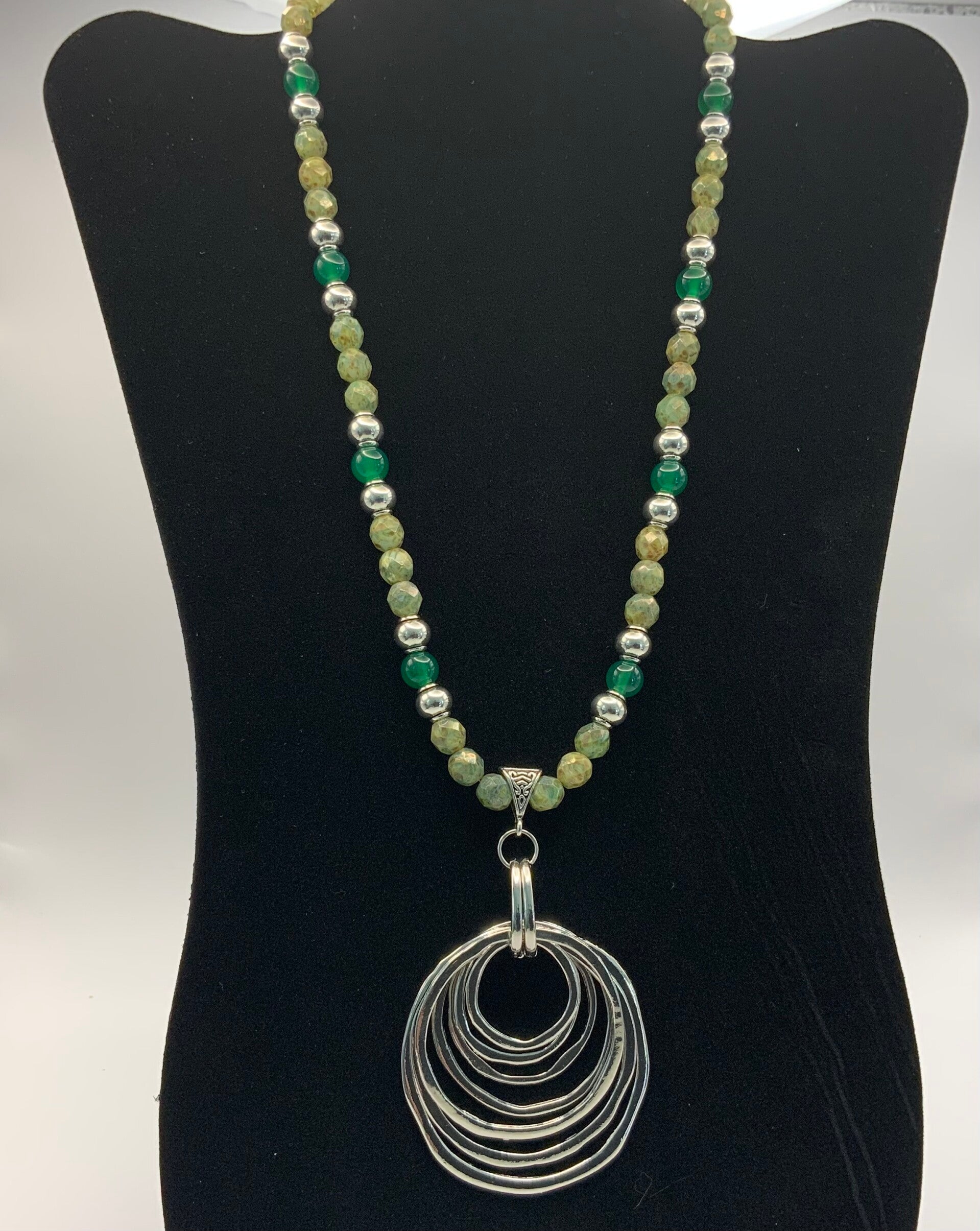 This beautiful snecklace measures 24 1/2" in length including the pennant. The pennant measures 2 1/2" round. The beading features faux jade to highlight the multi sage colored faceted beads. It is interspersed with metal spacers and features a toggle closure.