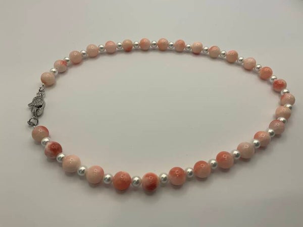 This necklace is so classic and evokes times gone by. It features peaches and cream colored beads along with faux pearls. The clasp brings in that touch of modern with a bit of bling. This necklace measures 18" in length.