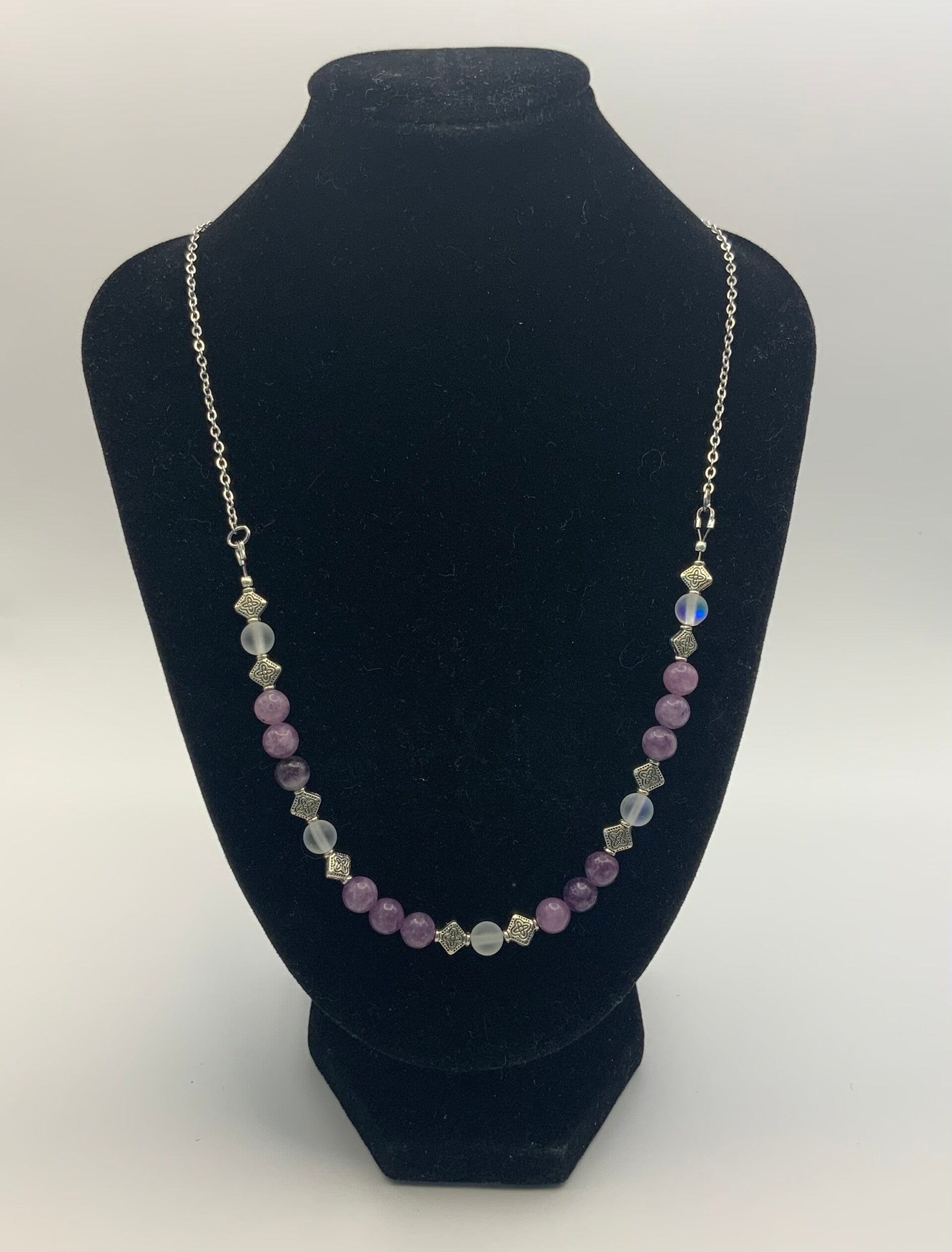 This necklace features genuine amethyst beads along with faux pearls and metal spacing beads. This necklace is 24" in length.