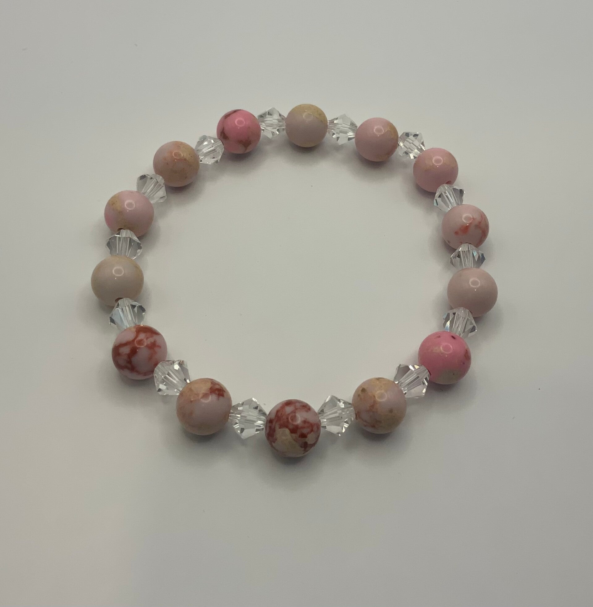 Multi-colored pink stones are accented with clear crystals. Great to wear alone or as a stacker bracelet. This is made for a size 7 wrist.