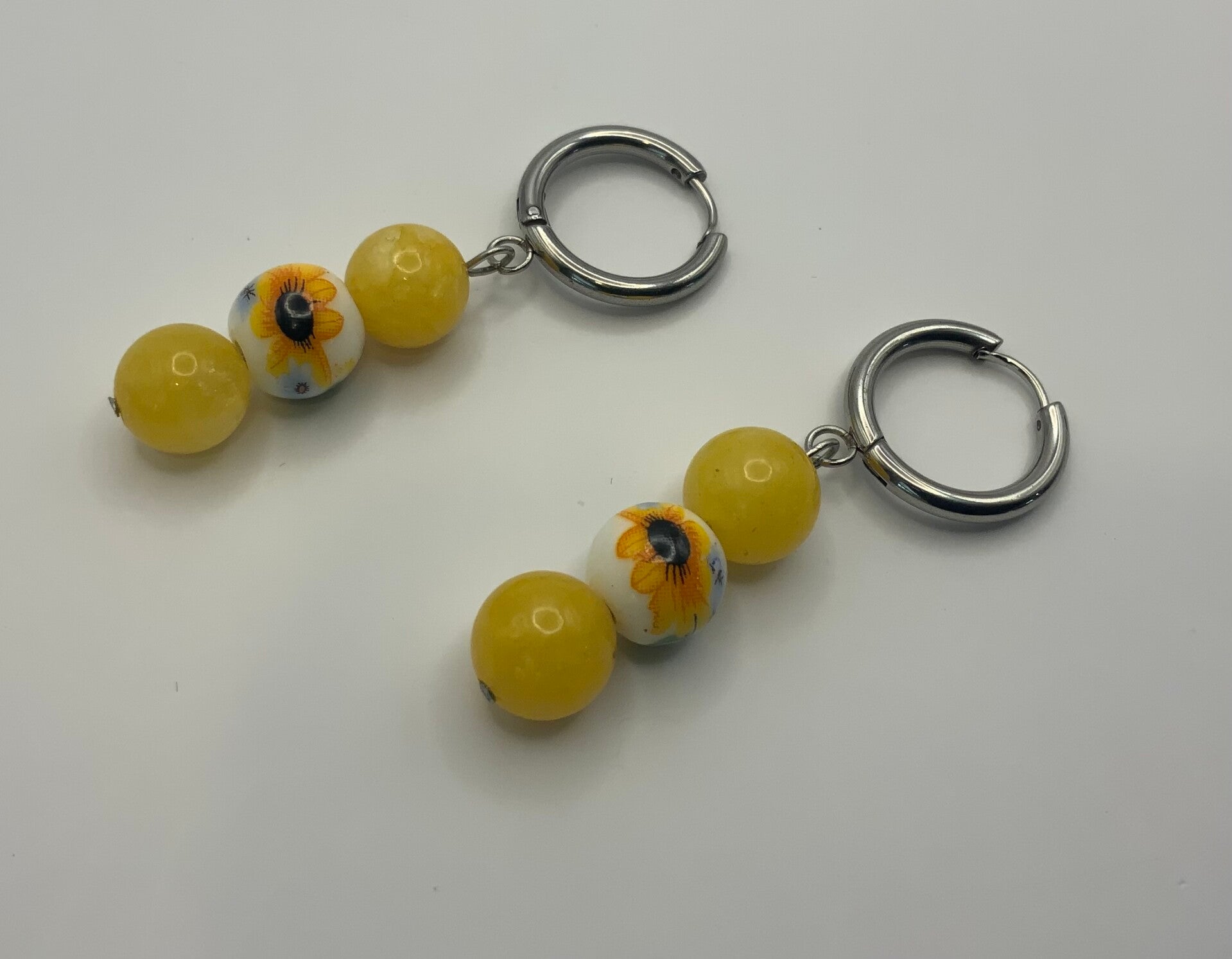 These surgical stainless steel hoops are paired with lemon jade and floral beads. The beads measure 1 1/2" in length.