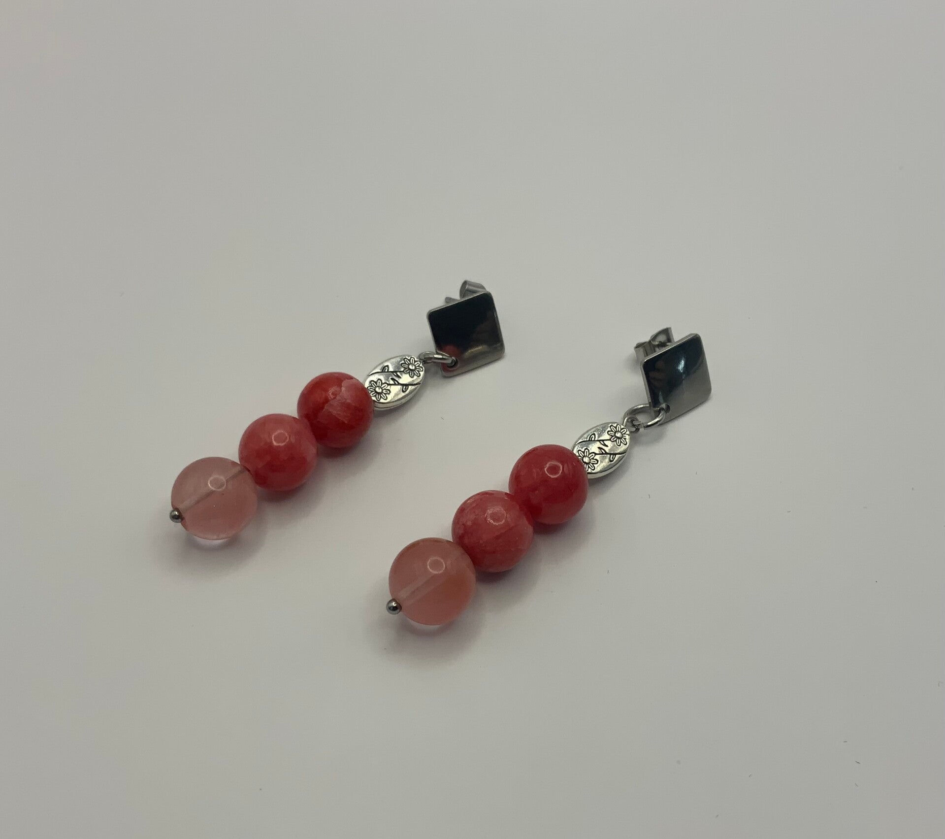 These surgical stainless steel posts have dark coral beads paired with light coral. These beads are topped with a metal flower imprinted bead. Beads hang 2" in length from the post.