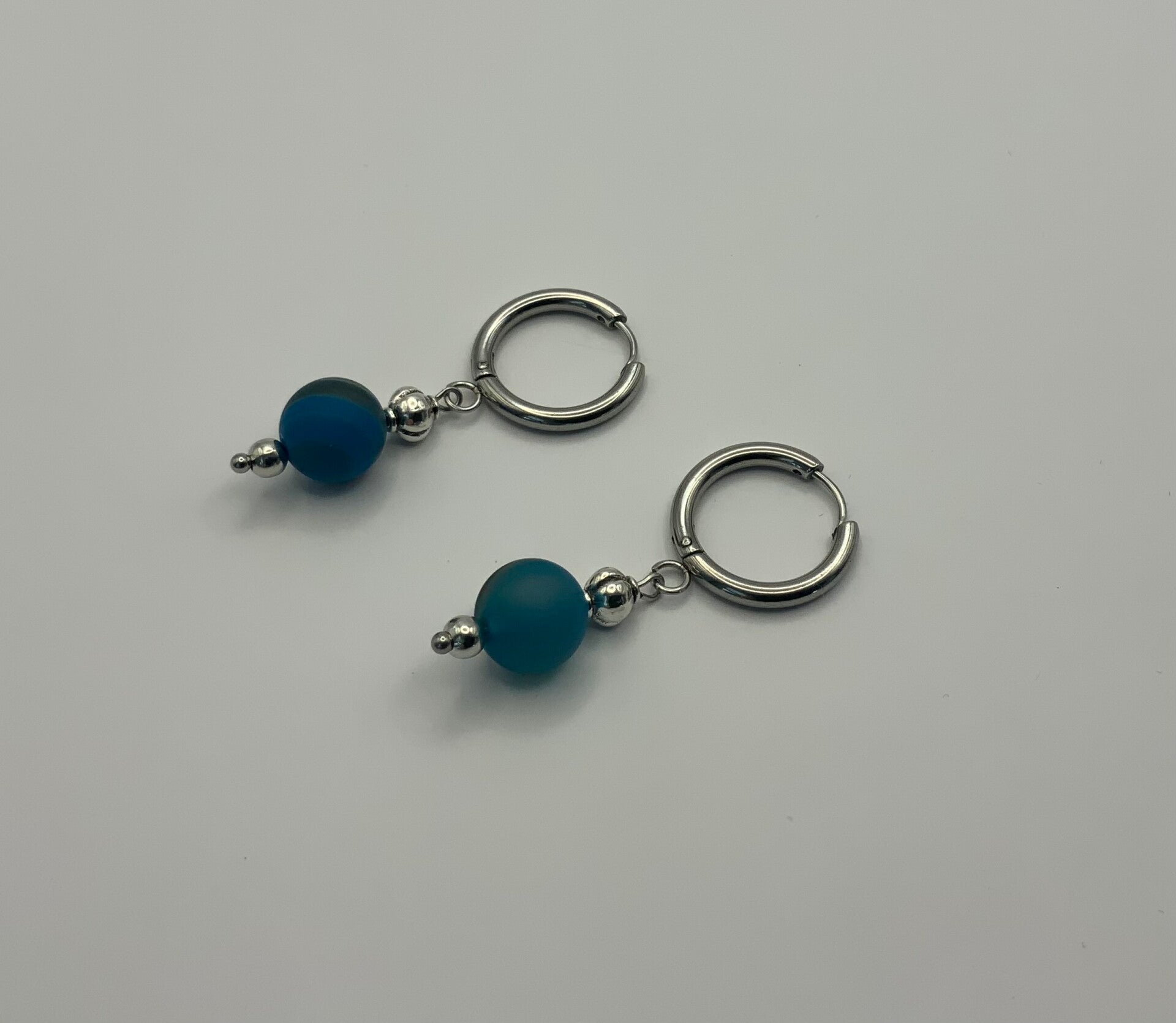 These blue beads with metal spacers hang from a surgical steel hoop. The hoop features a leverback closure. The beads hang 1" from the post.