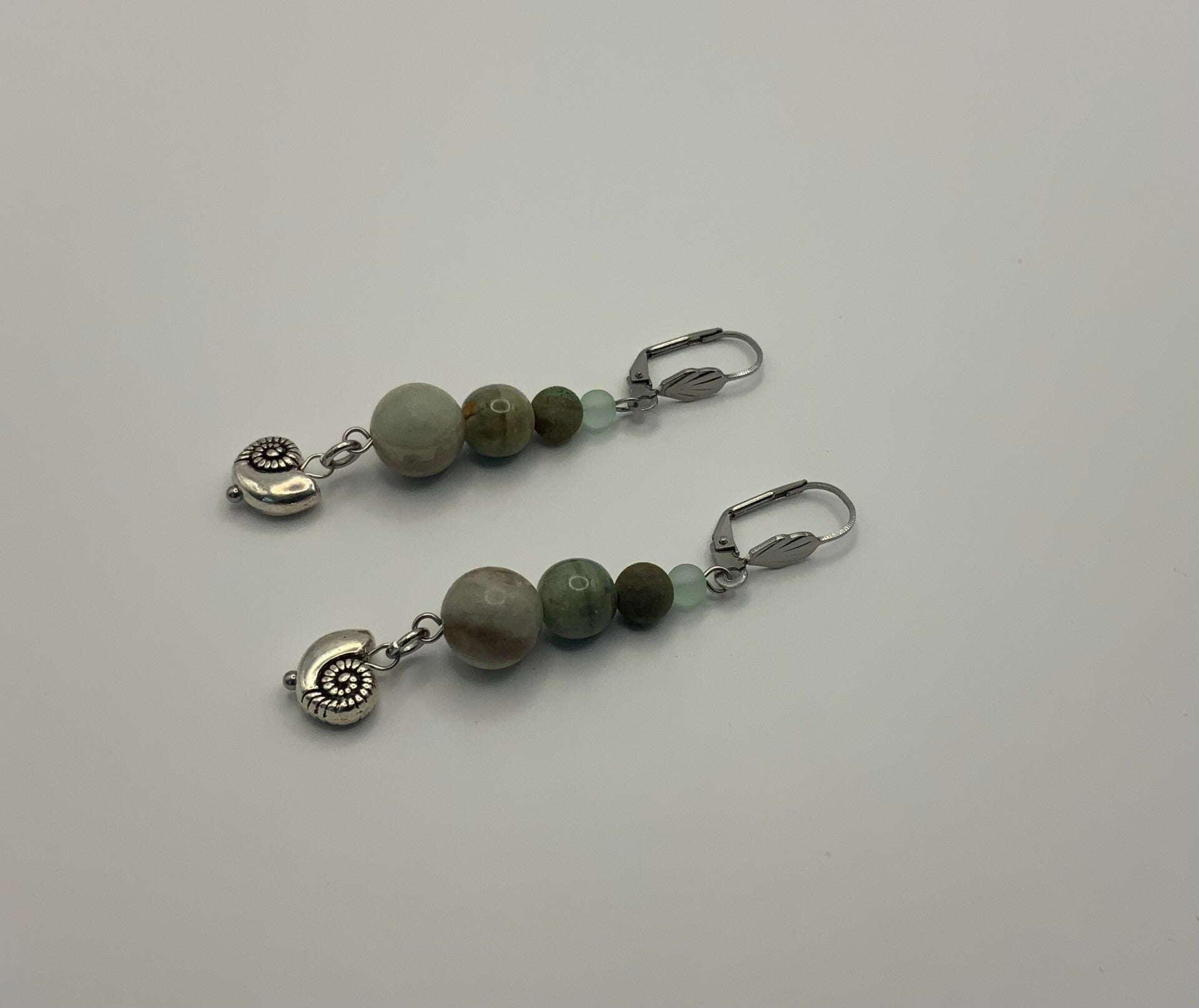 These earring posts are surgical stainless steel and feature a leverback closure. It has a cute little shell detail on the front of the post. Hanging from the posts are 3 different sized beads from which a metal nautilus shell hangs. The beads and she'll hang 2" from the post.