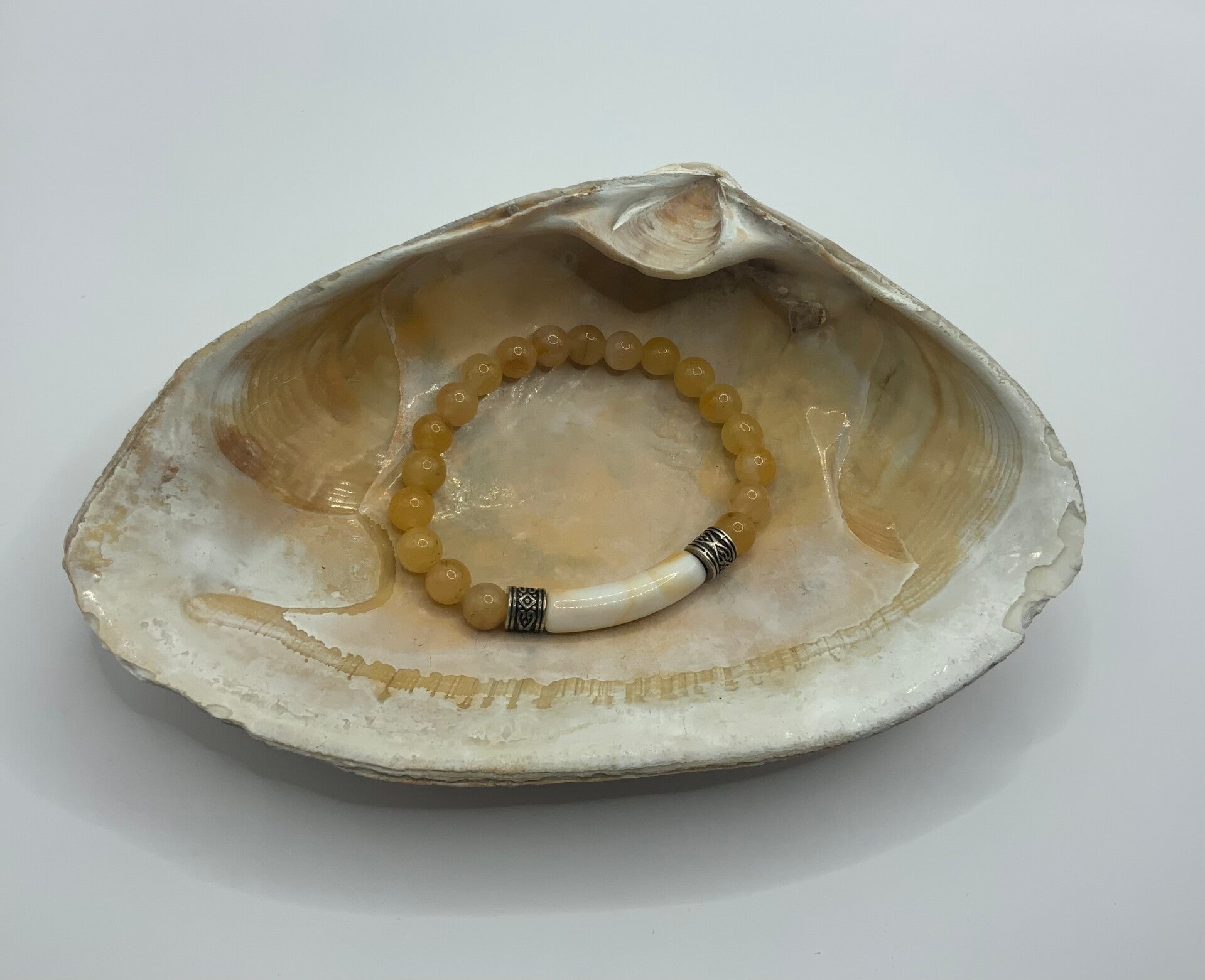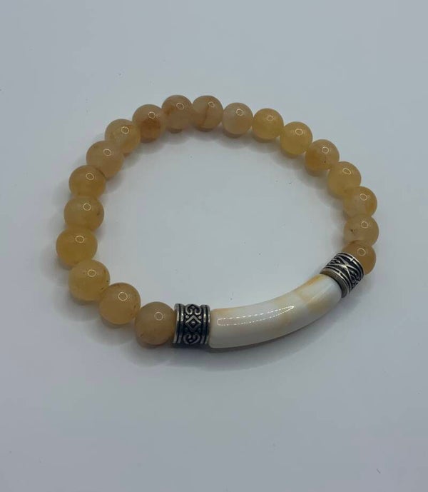 Genuine agate beads are accented with antique metal spacers that flank a white/gold tube bead. This is made for a size 6 1/2" wrist.