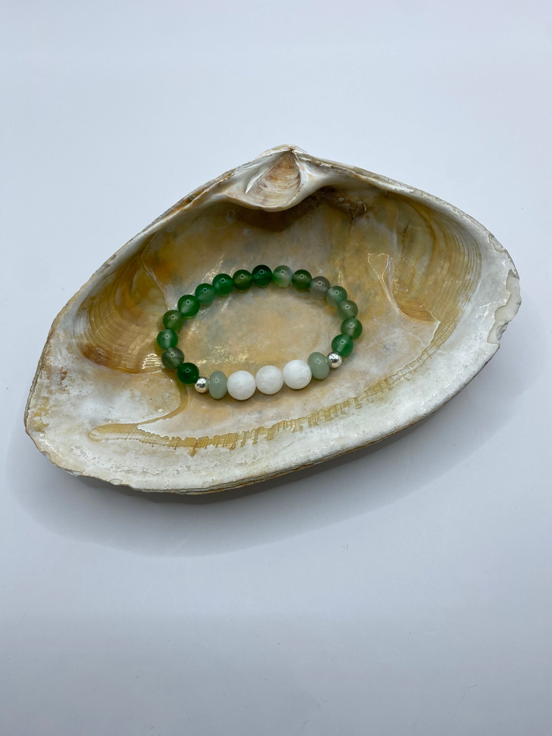 This beautiful genuine agate beaded bracelet also features 3 central white beads flanked by light sage glass beads and a silver metal spacer bead on each side. Perfect for your summer wardrobe. This was made for a size 6 1/2" wrist.