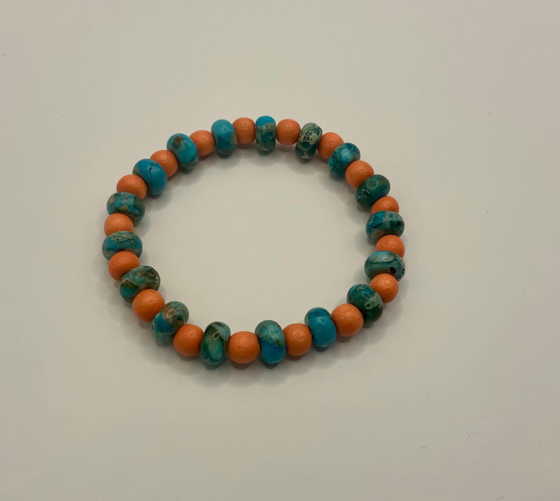 Imperial Jasper beads are paired with orange wood beads for this delightful bracelet. This looks great alone but can also be paired with another bracelet as a stacker. This is for a size 6 wrist.