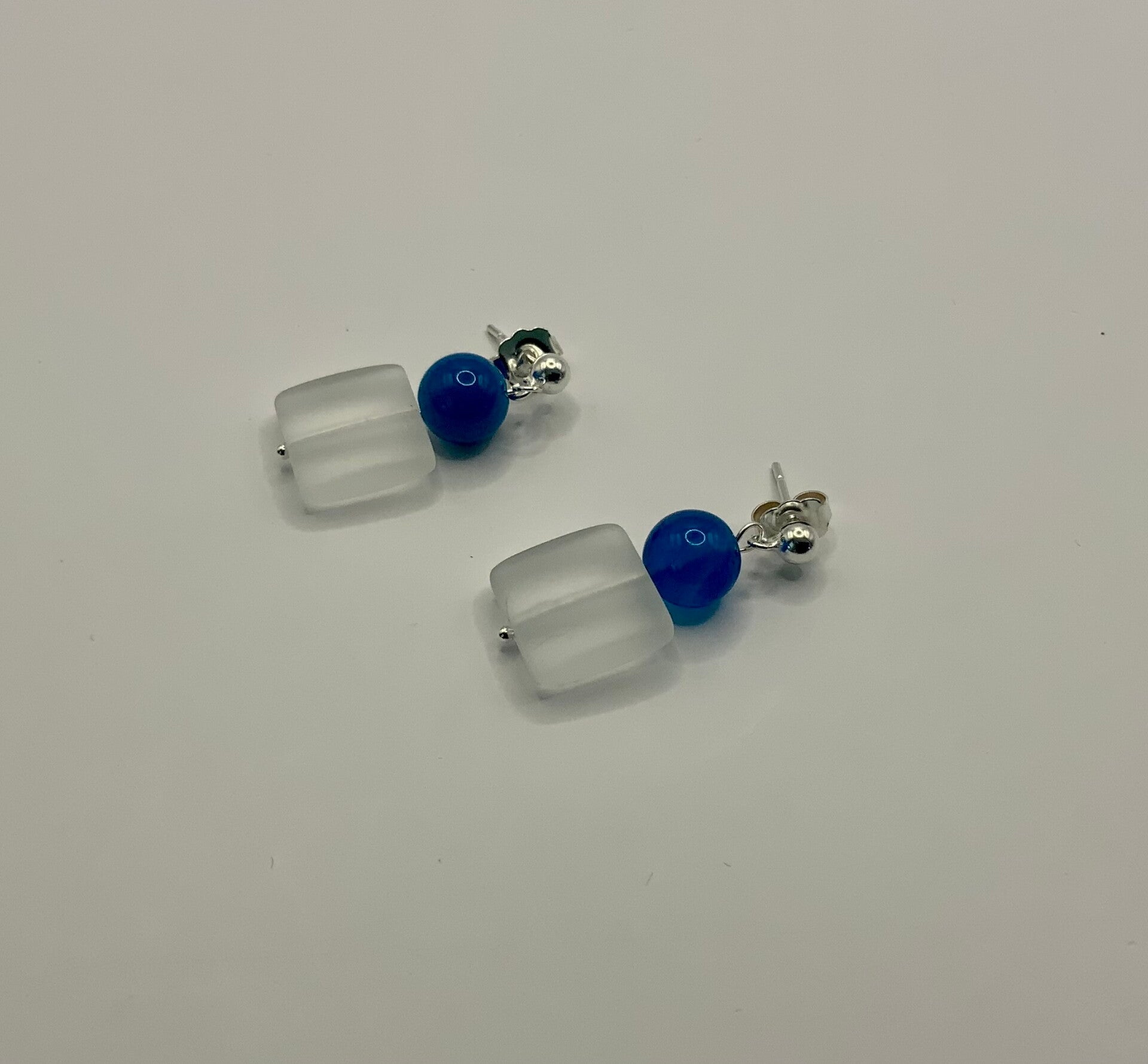 White Seaglass and ocean blue beads make up these 100% sterling silver balled post earrings. Beads hang 1" from the post.