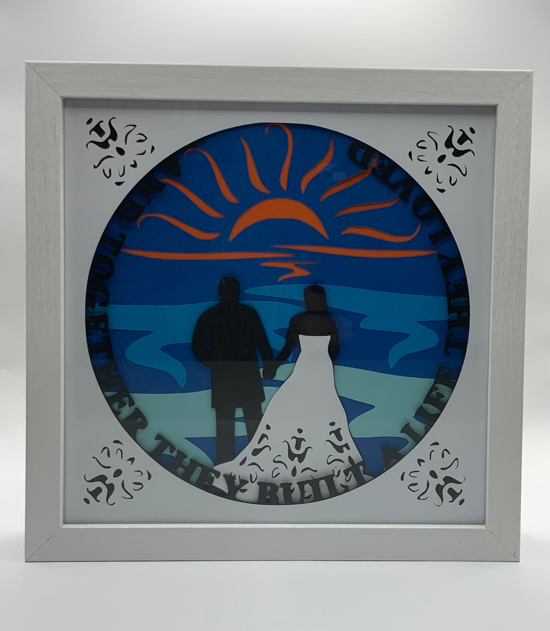 This white 9 x 9 Shadowbox frame features 3d artwork. A bride and groom getting married at the beach. With the words "And together they built a life they loved" encircling them.