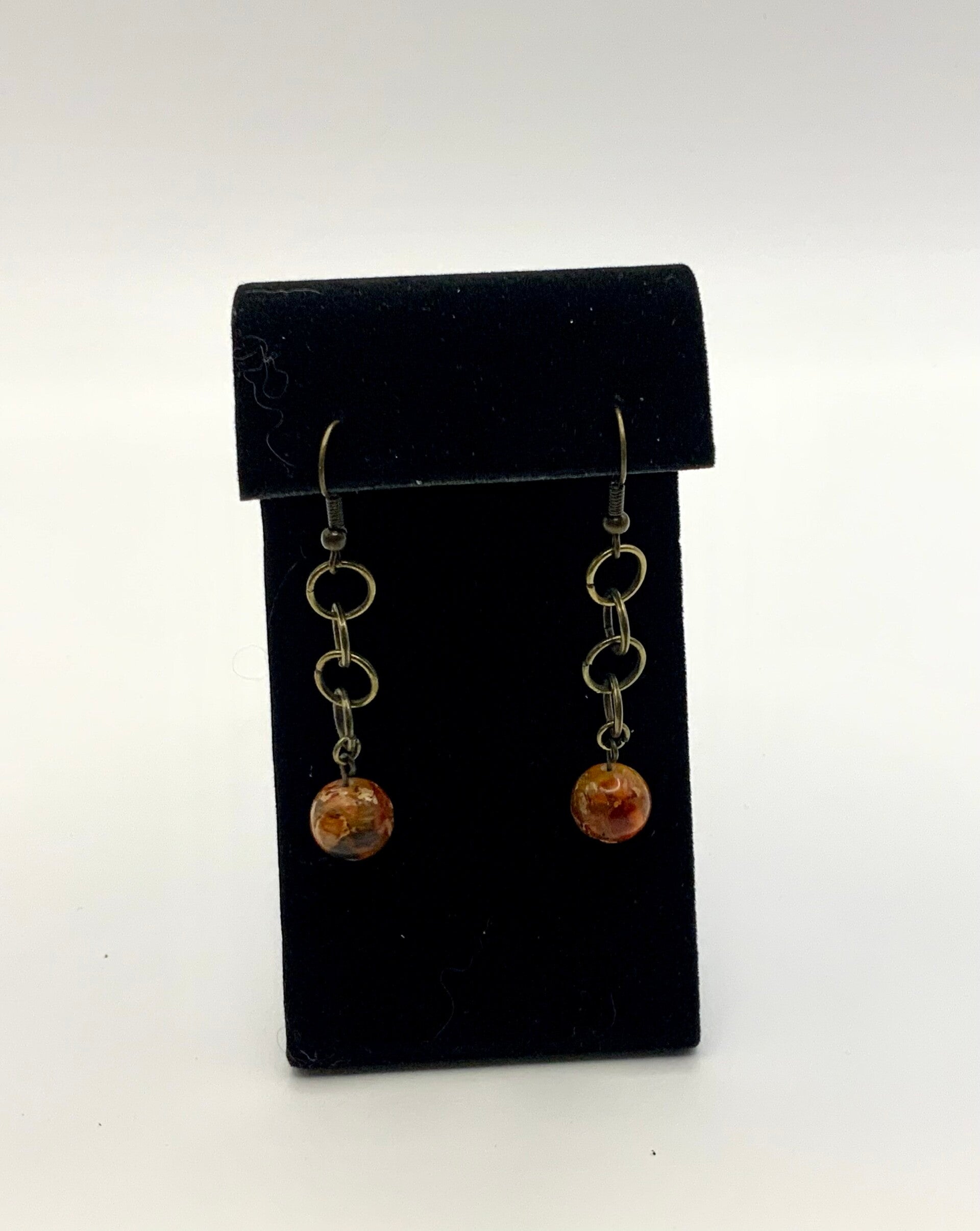 These earrings feature a Jasper stone hanging from a faux bronze chain. The posts for these earrings are faux bronze. Earrings hang at a length of 2 1/2" in length.