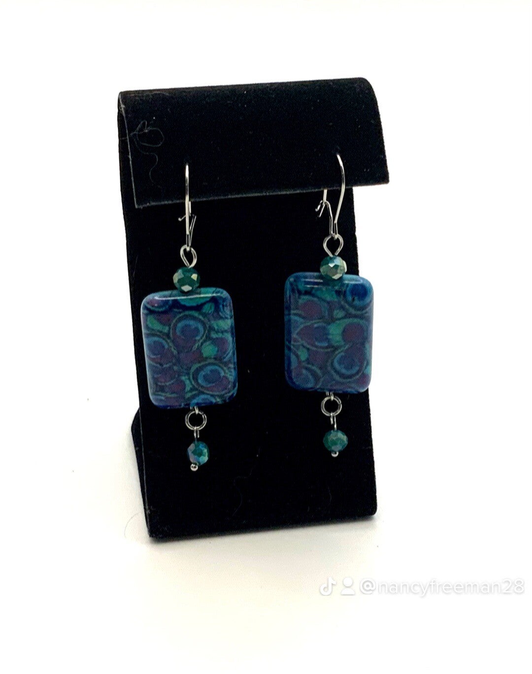 These beautiful peacock feathered earrings will delight. They feature a stunning colored feathered looking bead along with 2 faceted crystals. These beads hang from a surgical stainless steel post. Earrings length is 2 3/4" in length but they are very lightweight.