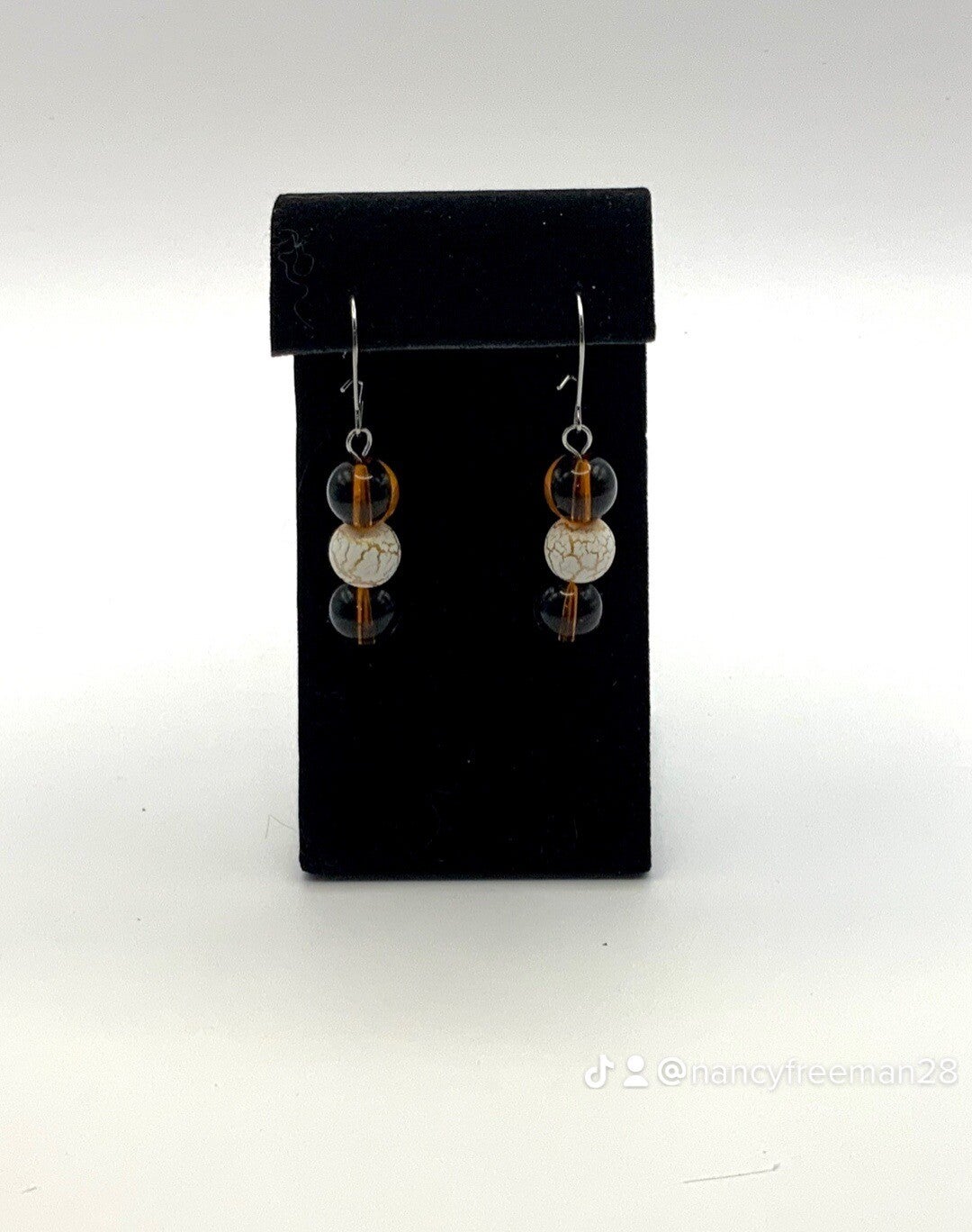 These earrings feature genuine amber and a white and gold crackled bead. They hang from a surgical stainless steel earwire. Earrings are 2 inches in length and extremely lightweight.