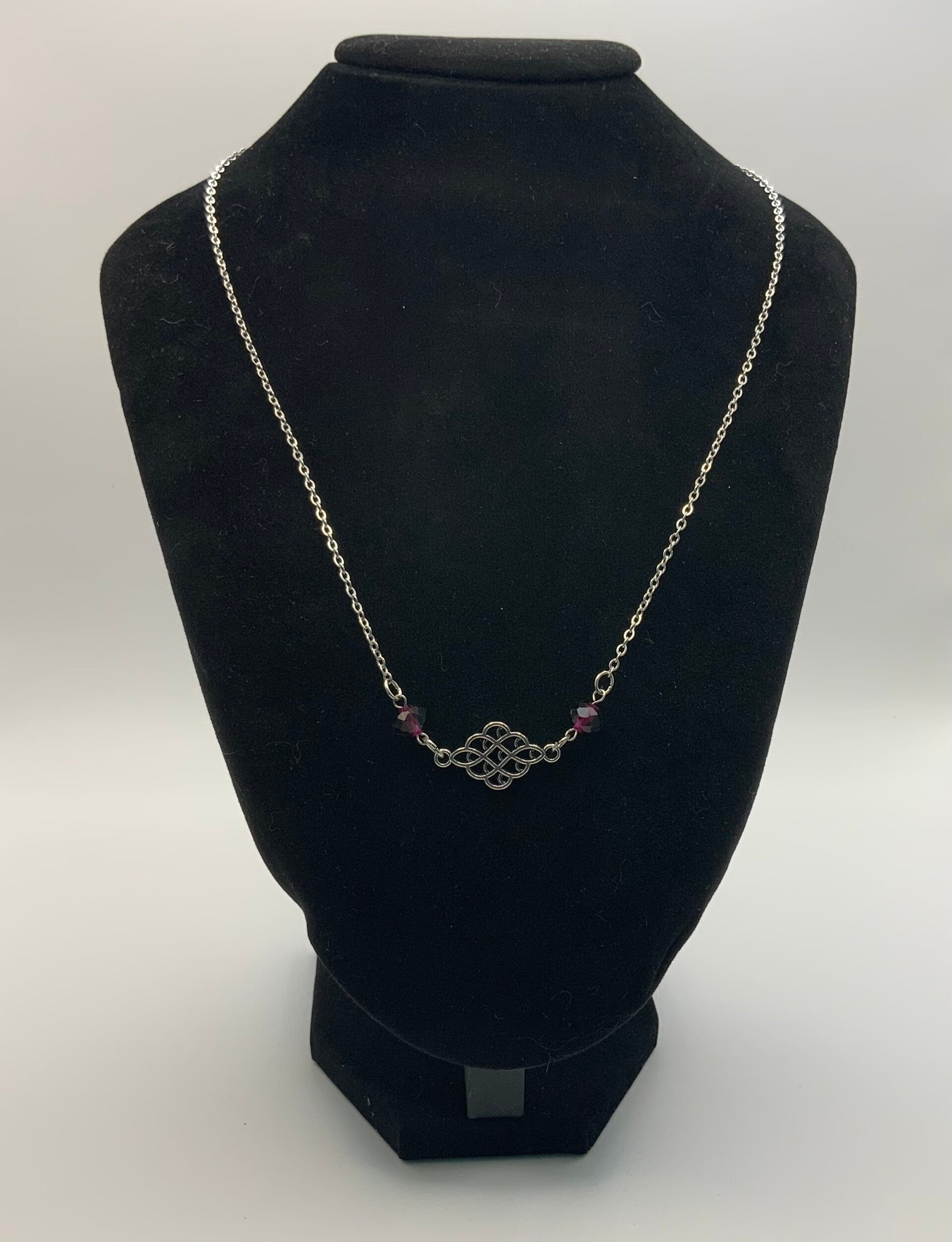 This surgical steel necklace features a filagree metal pendant with 2 deep purple faceted crystals on either side of it. This necklace measures 18" in length.
