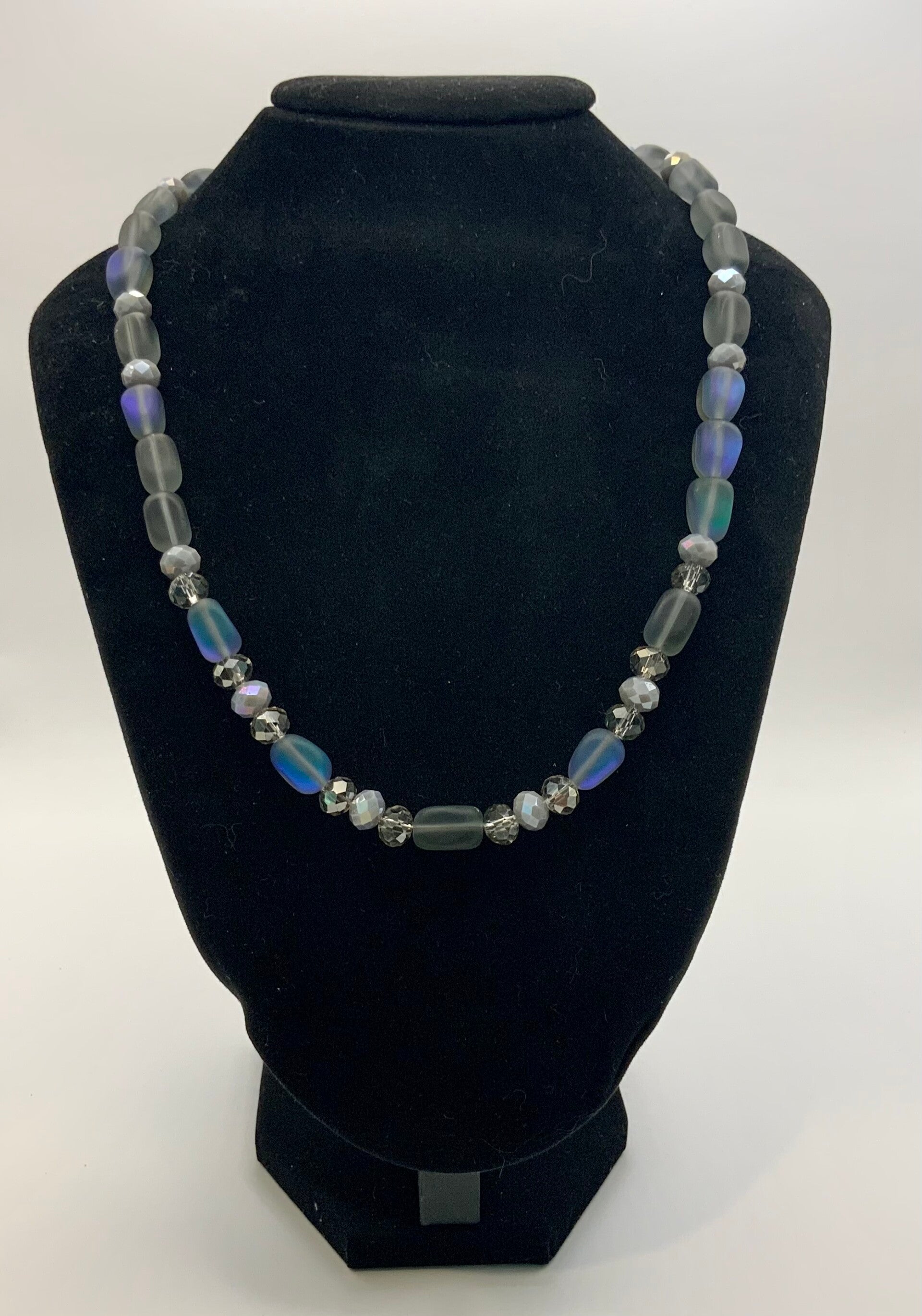 This beautiful glass beaded necklace is stunning. It features holographic glass beads along with faceted crystals in 2 different colors. The necklace measures 18" in length.