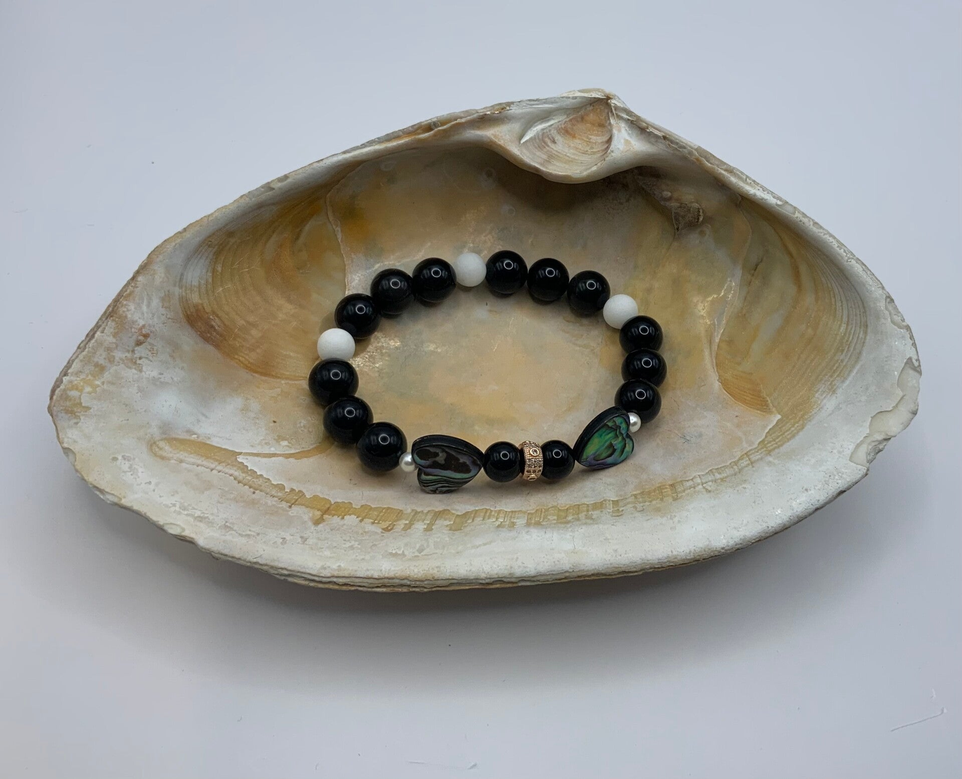 This black and white stretch bracelet is sure to please. Along with the black and white beads this bracelet also features abalone hearts, 2 faux pearls and a copper central bead with a bit of bling. This is for a size 6 1/2" wrist.