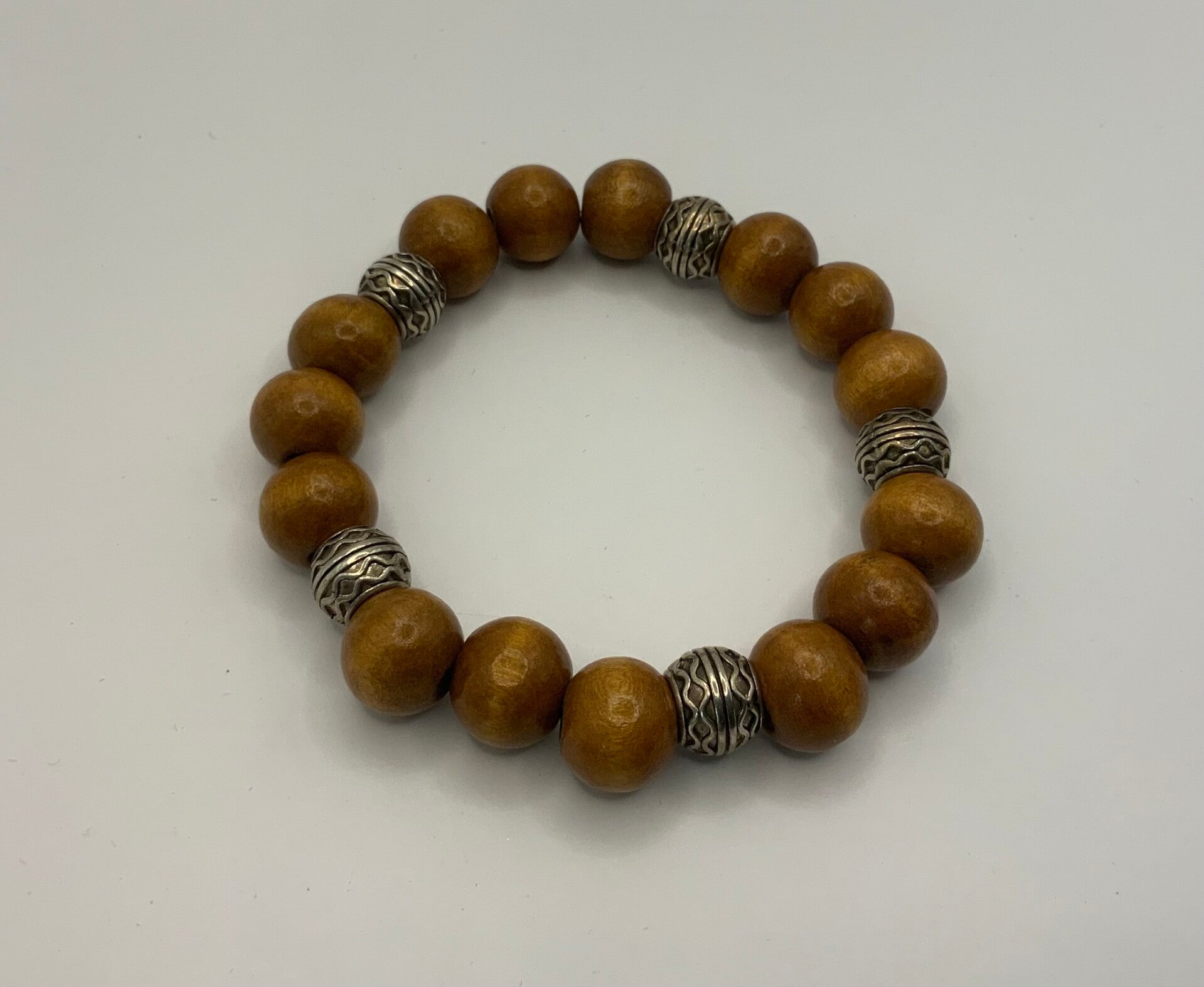 These beautiful buffed wood beads will look handsome on any wrist. They are interspersed with antigue metal barrel beads. This was made for a size 6 1/2" wrist.