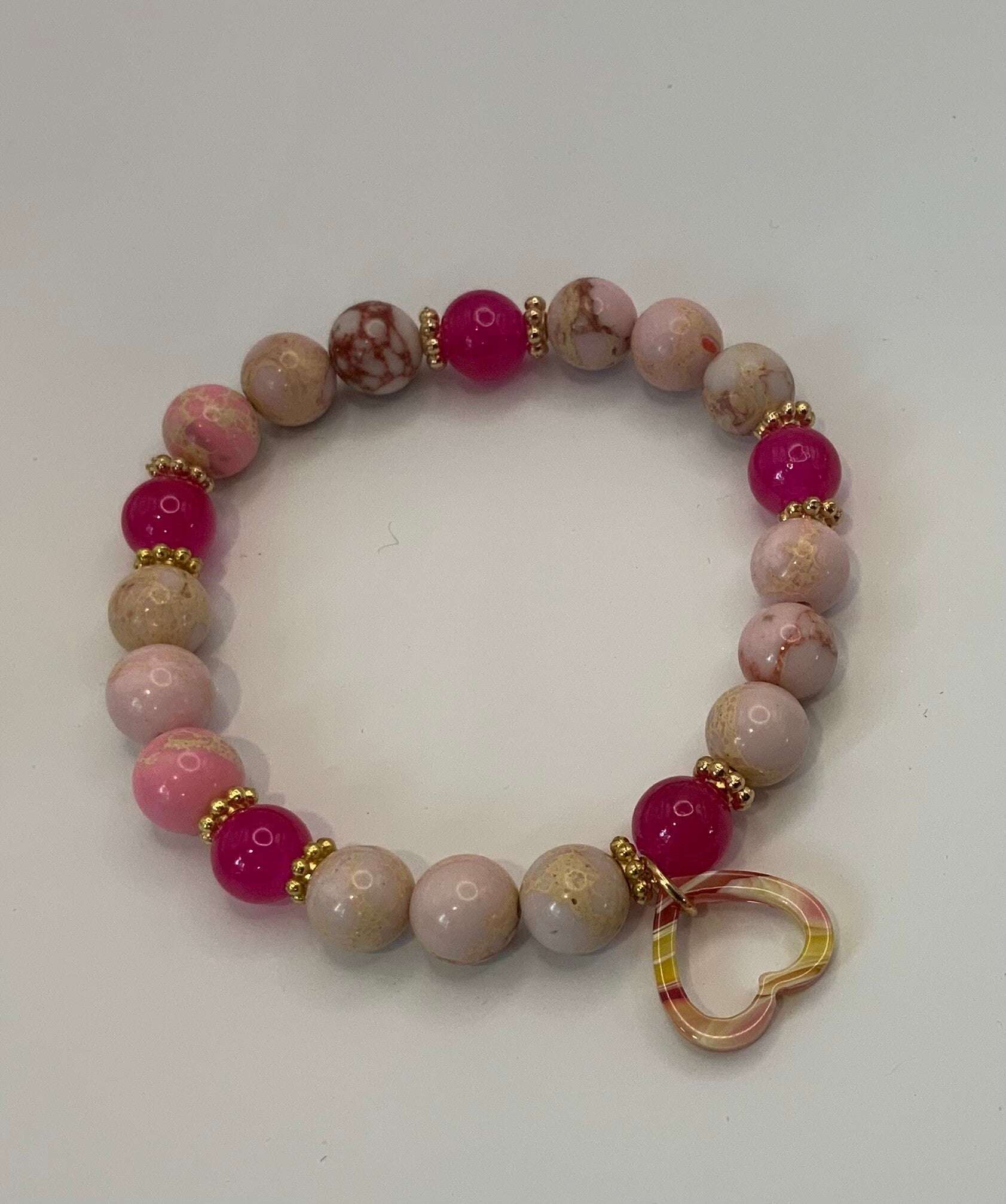 This lovely bracelet features mottled agate beads along with Fuscia quartz beads. Gold plated spacers highlight this bracelet along with a matching heart as a dangling charm. This bracelet is made for a size 6" wrist.