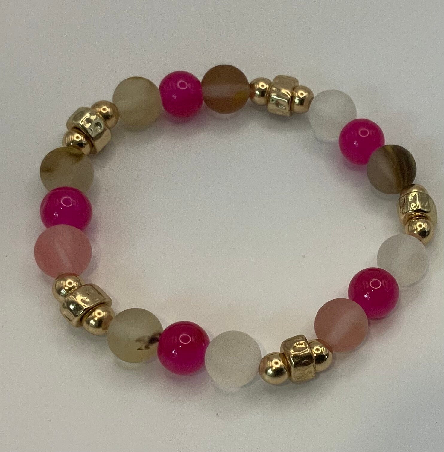 This lovely bracelet features Fuscia beds among glass beads. Gold plated metal spacers are used throughout to make this bracelet pop. This bracelet was made for a size 6" wrist.