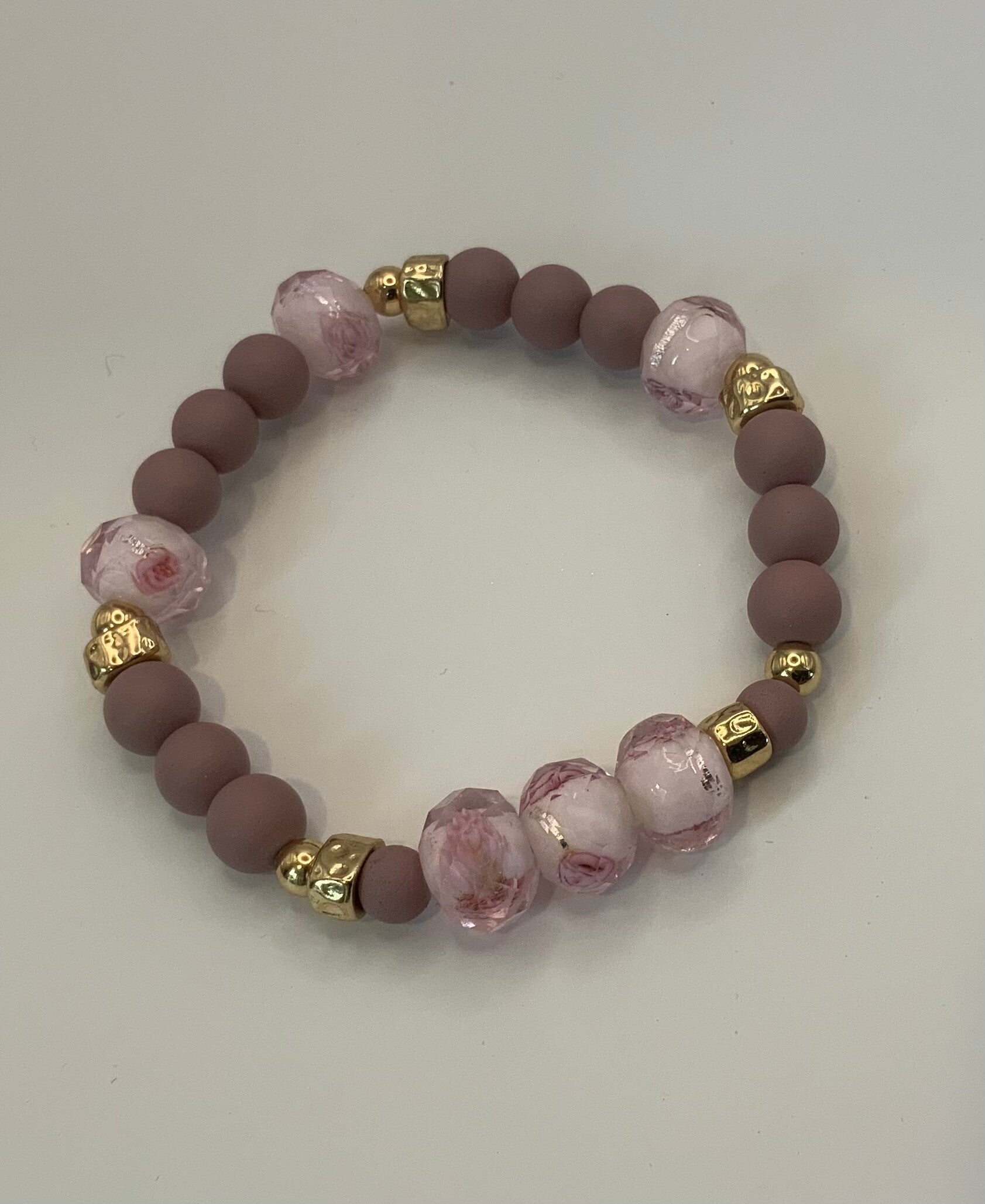 Beautiful floral Czech glass beads are interspersed with matte mauve beads. Gold plated metal add just the right touch of bling to bring out the colors of this bracelet. This bracelet was made for a size 6 1/2" wrist.