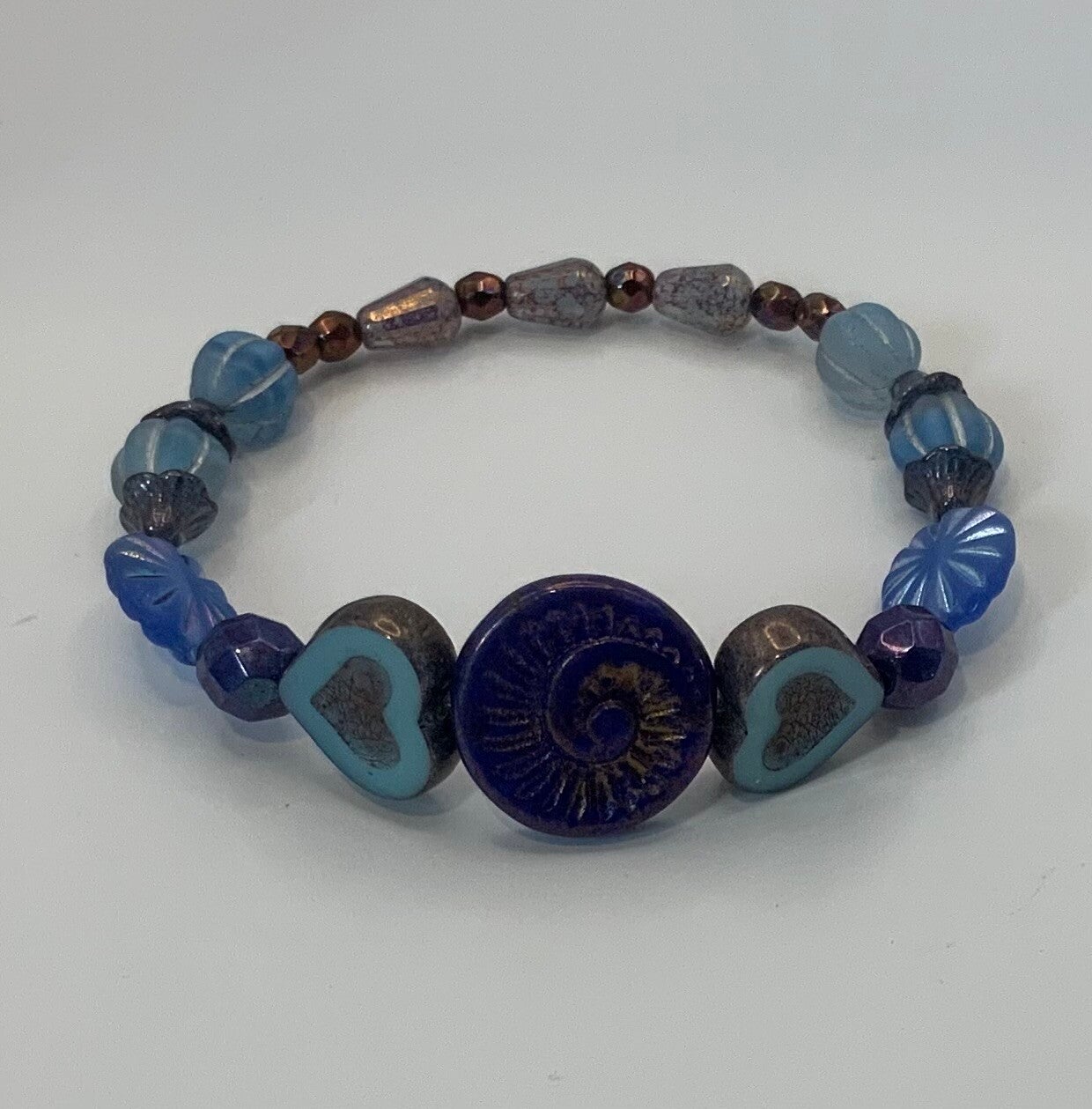 This bracelet made entirely of Czech glass is a stunner. Vivid shades of periwinkle blues will compliment any wrist. This bracelet was made for a size 6 1/2" wrist.