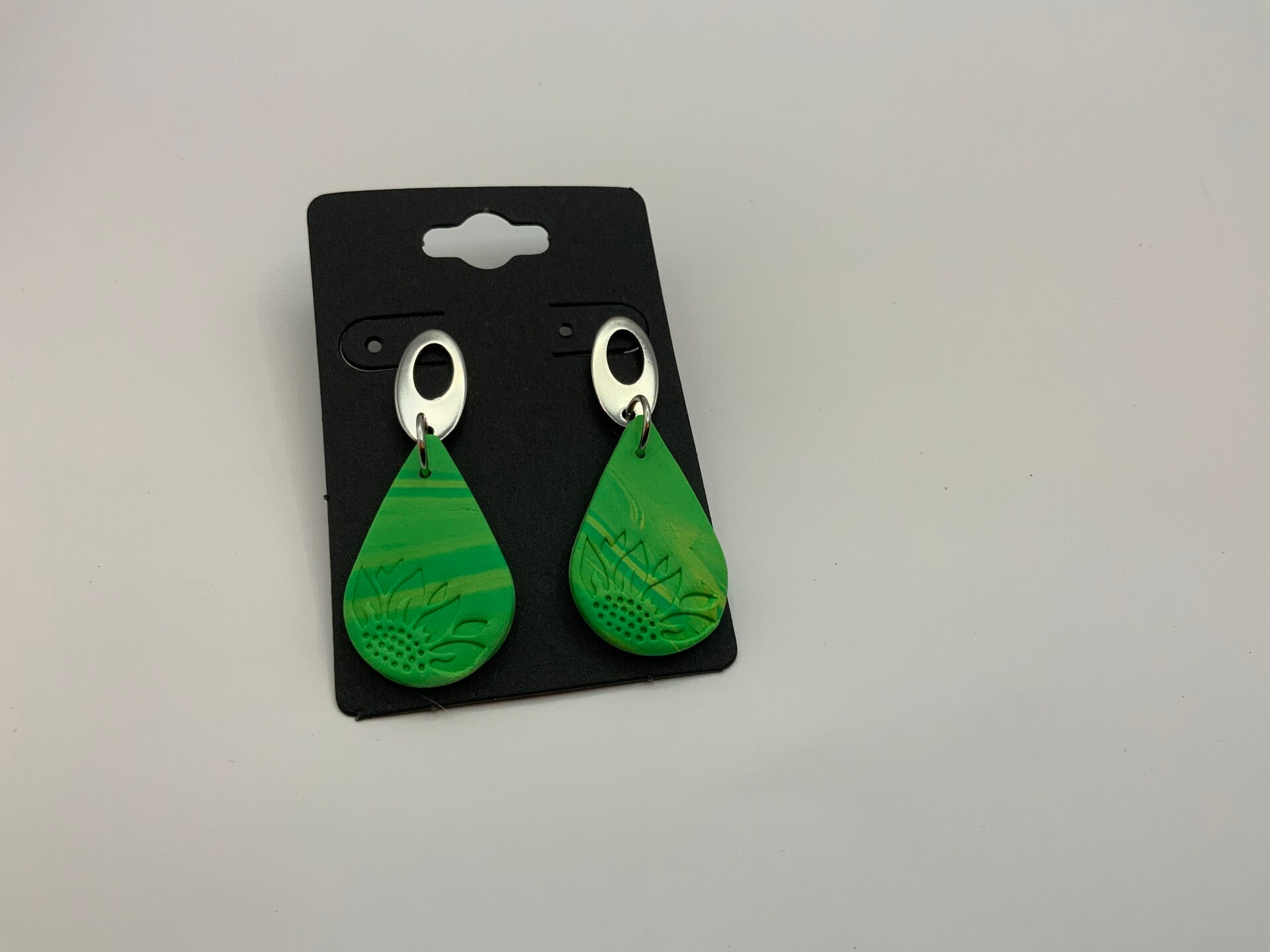 Do you want dangling earrings but hate the weight on your ears? These are what your waiting for. Hand sculpted, these earrings are lightweight and stylish. Perfect for all your outfits. These earrings hang from surgical stainless steel posts and feature an imprinted sunflower design.