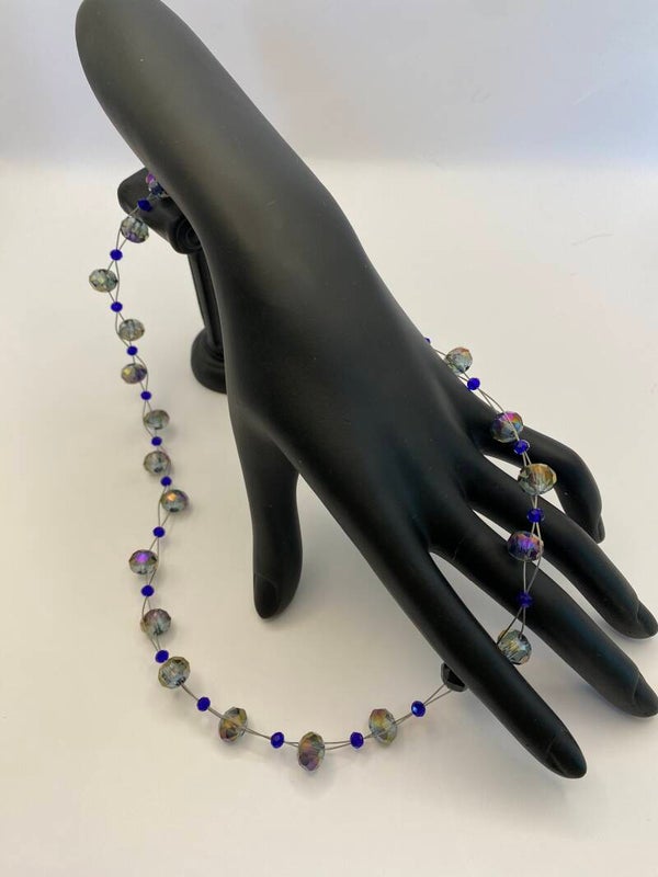 This gorgeous floating necklace features prism colored Czech glass along with royal blue Czech glass beads. This necklace will definitely turn heads when you wear it. Perfect for that special occasion or anytime you need a bit of bling in your life. This necklace measures 22" in length. This features a lobster claw closure.
