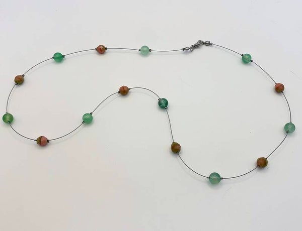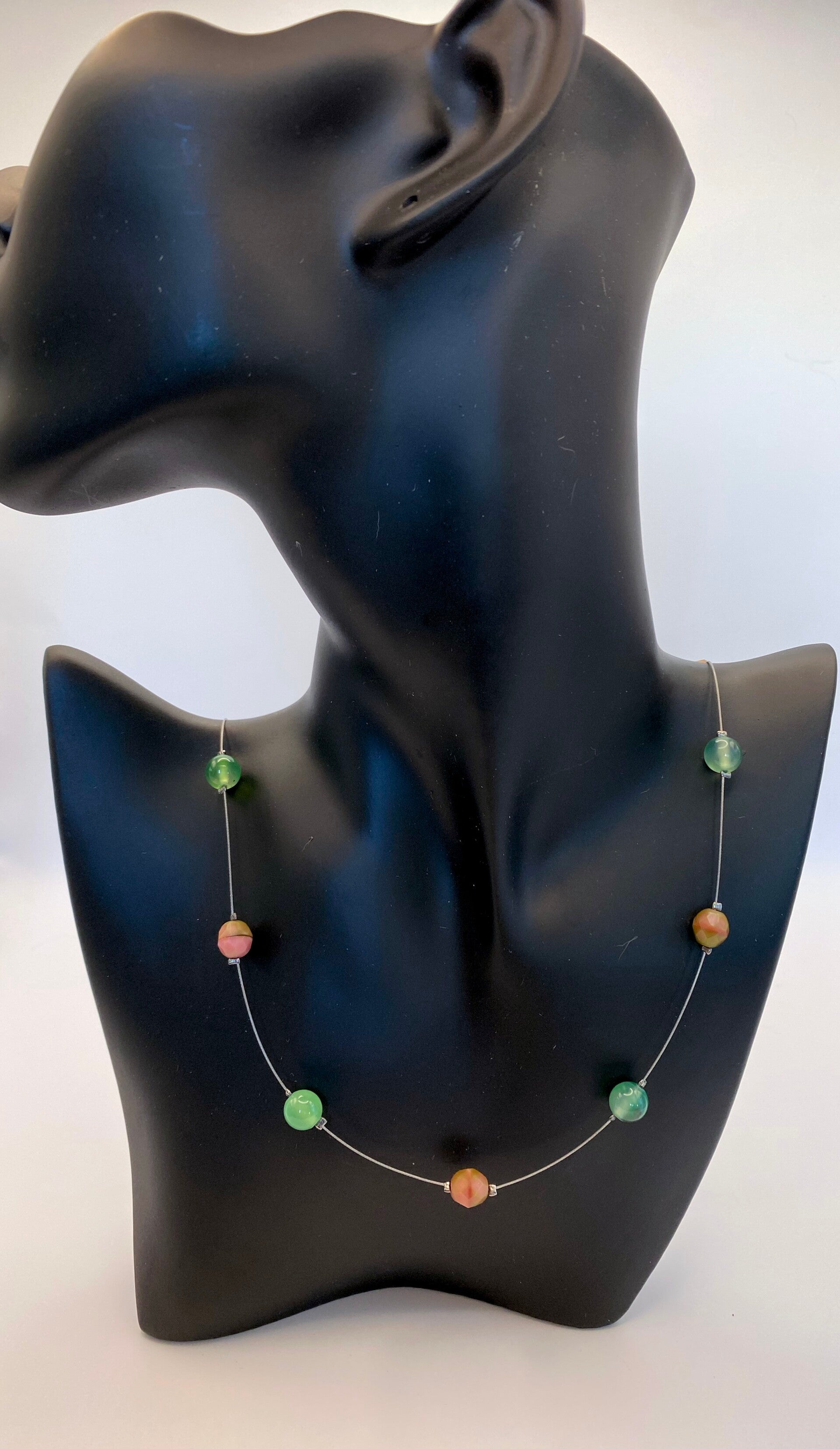 Lightweight and dainty describes this necklace. Made from watermelon colored faceted Chezch Glass beads and light green glass beads this necklace will look fabulous on anyone. This necklace is 27" in length and features a lobster claw closure.