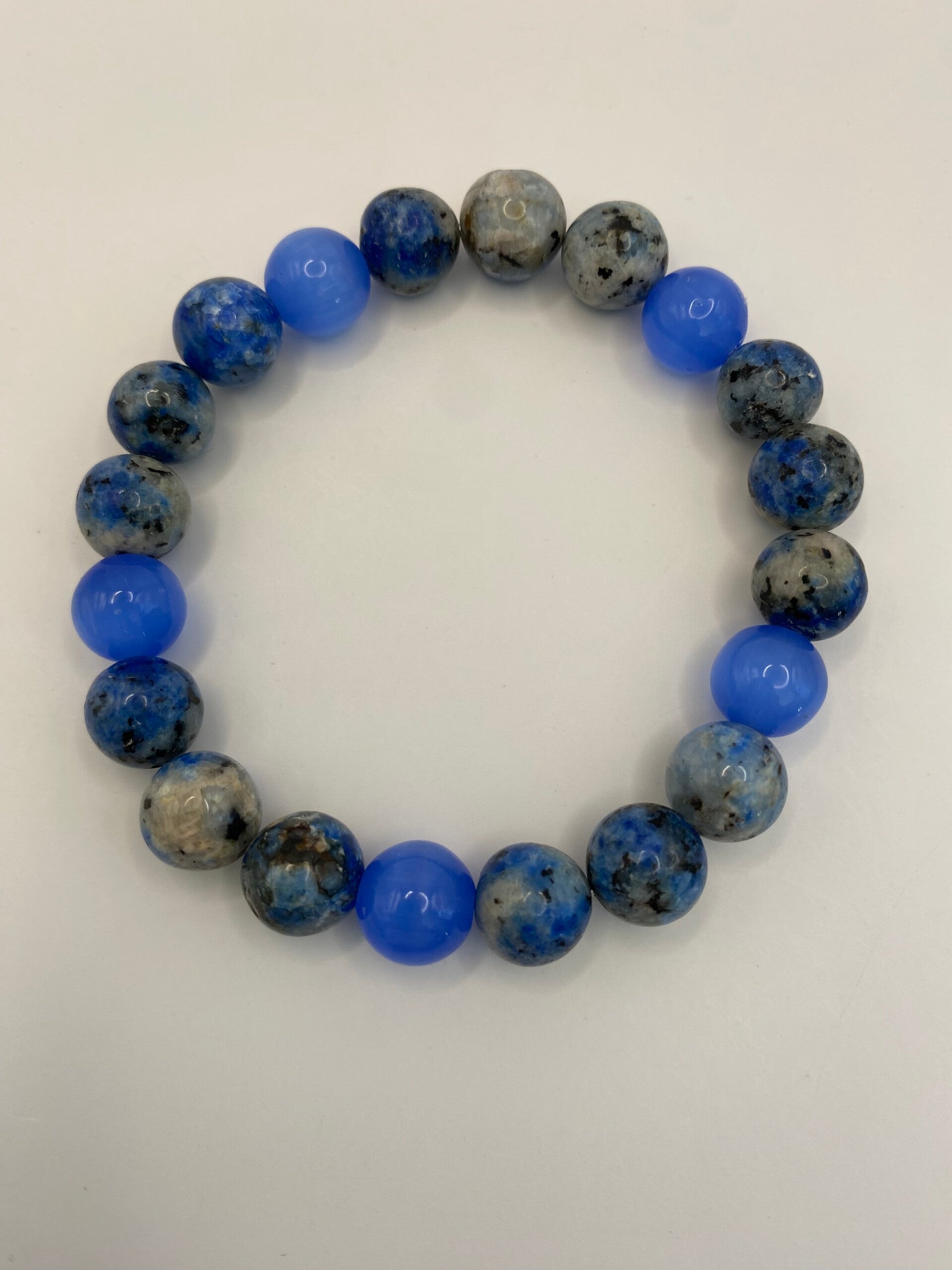 This lovely stretch bracelet is made from agate beads along with periwinkle glass beads that pull the color from the agate. Perfect dressed up or down this is the bracelet for you. This was made for a size 6 1/2" wrist. Always measure your wrist to make sure of your size.