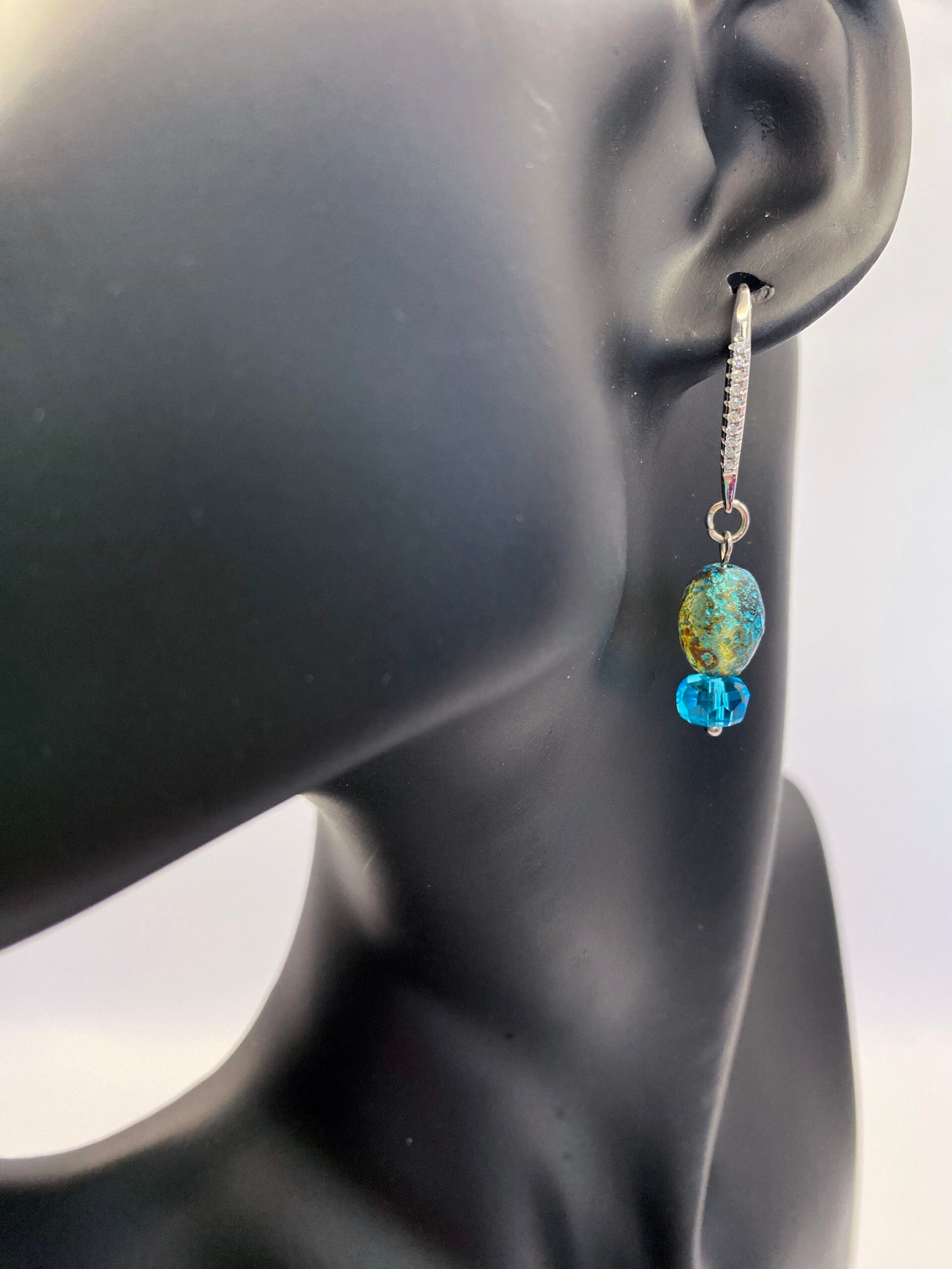 These gorgeous earrings pair perfectly with the Santorini bracelet. The peacock colored glass bead is complimented by the crystal rondele bead on the bottom. These posts feature faux diamond chips down the front side of them. These are leverback posts that hang approximately 2 3/4". These are extremely lightweight on the ear.