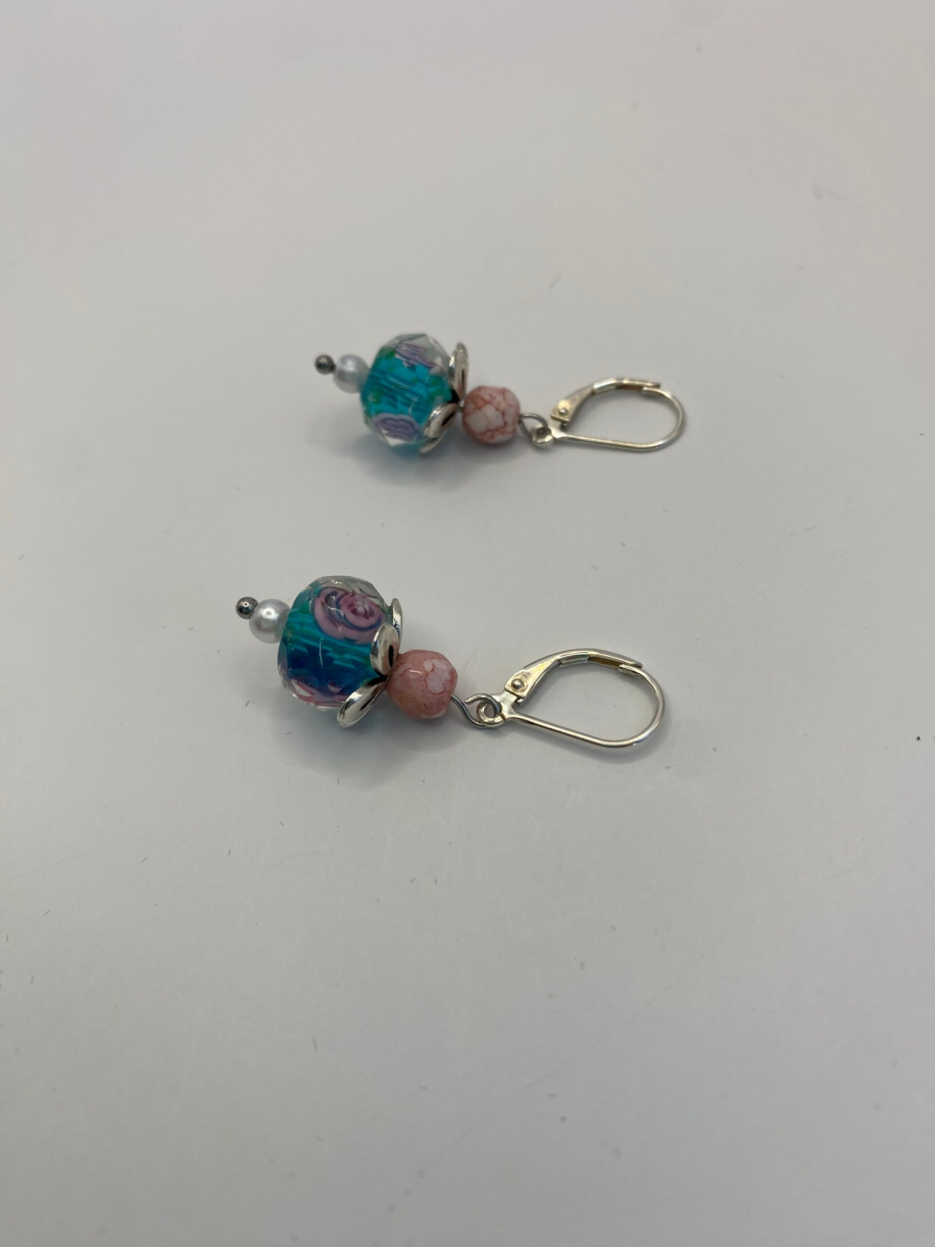 These cute earrings are what you need to chase away the winter blues and hearald in summer. They feature a floral design lampwork bead accented with 2 smaller beads. A sterling silver floral accent sits on top of the lampwork bead. These feature a sterling silver leverback post and hang approximately 2 1/2".