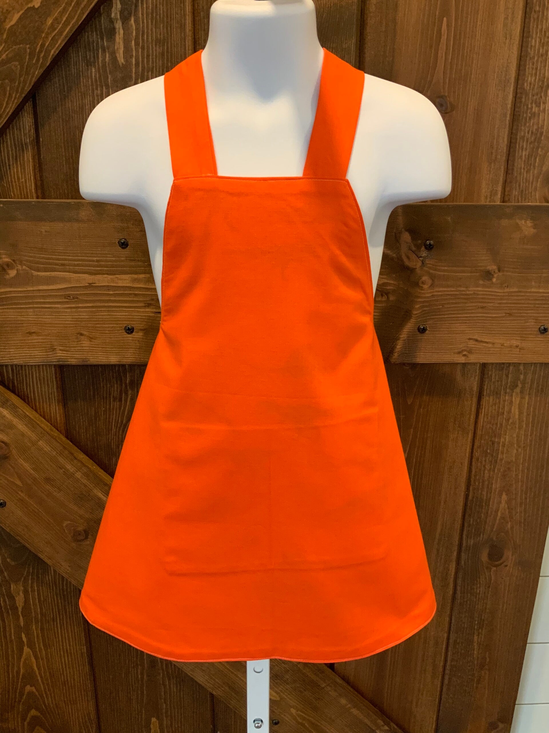 Boys 100% cotton apron featuring cute little dinosaurs. Apron is top stitched and all pockets and straps are reinforced. The complimentary orange back makes this apron reversible. Nice size pocket to keep all your child's treasures. Machine wash cold and air dry.