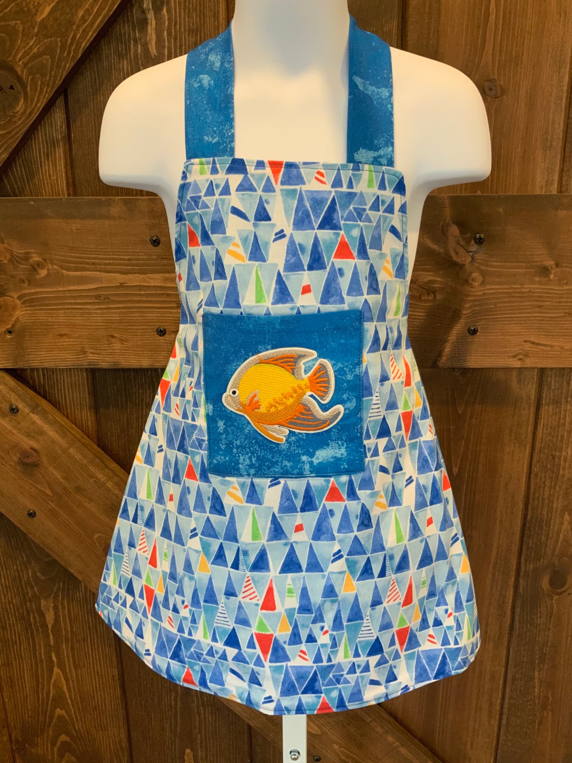Boys 100% cotton apron features colorful sailboats and fishy decal on pocket. All aprons are top stitched. Pockets and strapping are reinforced. Complimentary fabric on the back makes this apron fully reversible. Machine wash cold and hang dry.