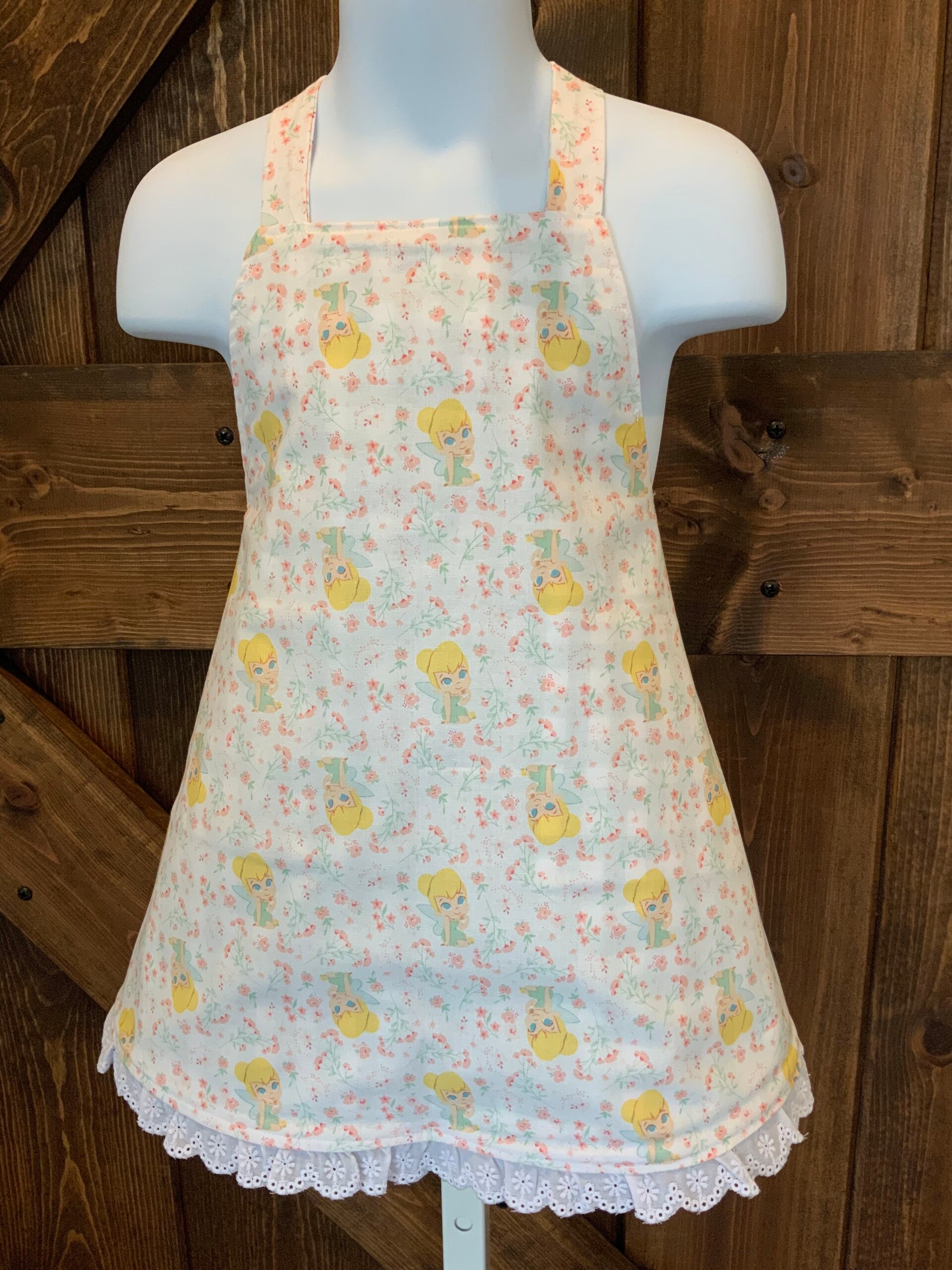 This apron is 100% cotton gingham and features tinker belle pockets and lace edging on the bottom. The coordinating tinker belle fabric used for the back makes this fully reversible. This apron is top stitched and all pockets and strapping have been reinforced. Machine wash cold and hang dry.