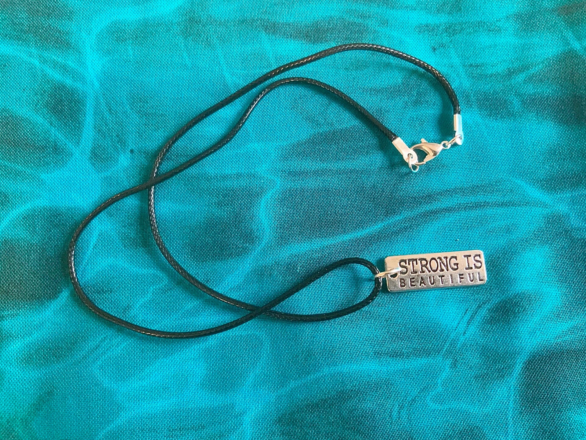 This 16" necklace is on a black cord with a bear claw clasp. It features the inspirational message that Strong is Beautiful.