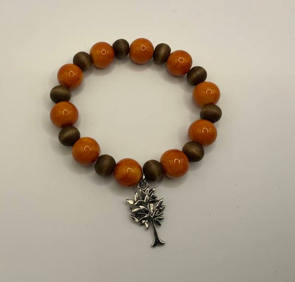 This lovely fall colored stretch bracelet features 10mm pumpkin colored glass beads along with 8mm brown wooden beads. A dangling tree charm measuring 3/4 inch will put you right in that fall state of mind. Pair this with the Fall Is Here Stacker for a beautiful combo you'll want to wear again and again. This is made to fit a size 6 wrist.