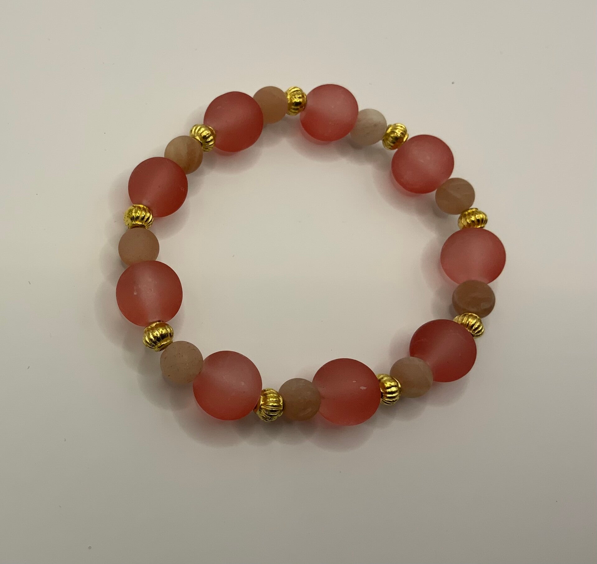 This beautiful coral colored bracelet has 10mm glass beads that are highlighted by striped stone beads and metal. This will not overwhelm the small wrist. This is made for a size 6 wrist.