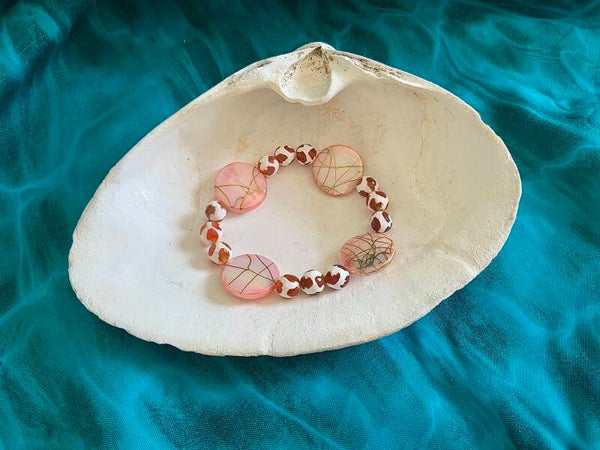 This lovely bracelet features gold gilded Pink beads highlighted by smaller glass beads. This is for a size 6" wrist.