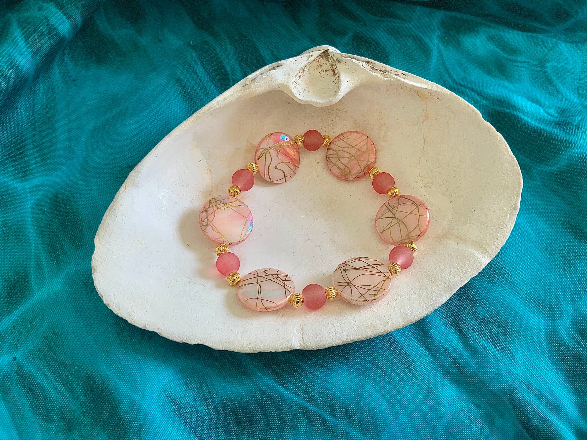 The gilding on these beautiful round glass beads is highlighted with just the right touch of gold. This is a stunner for sure. This is for a size 7.5" wrist.