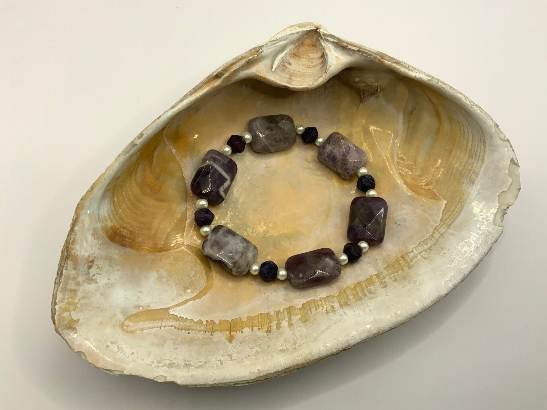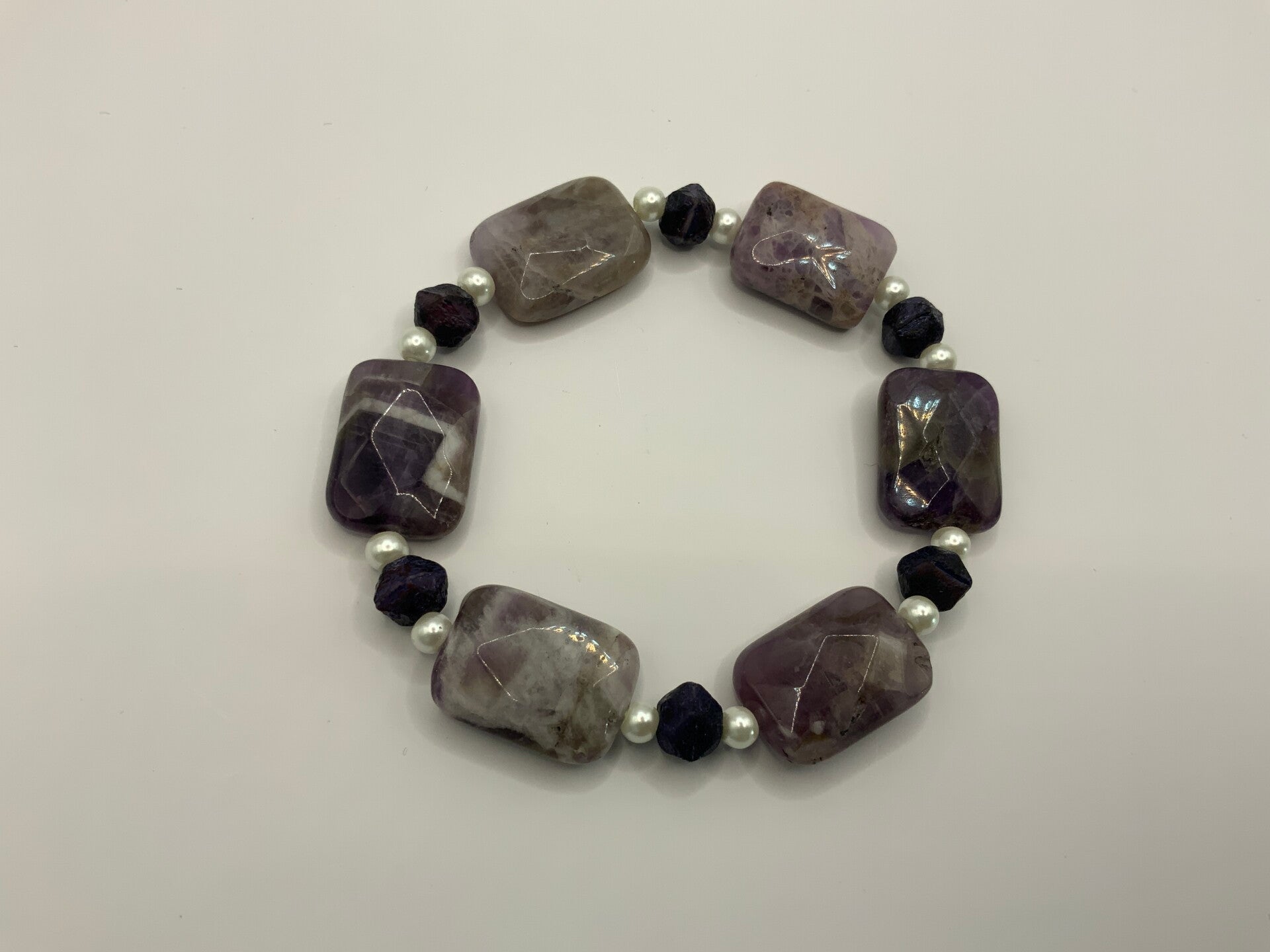 This natural polished Amethyste bracelet could be worn with some of our necklaces. This natural stone bracelet is highlighted by faux pearl and deep purple stones. This will work for all occasions. This is for a size 7 wrist.