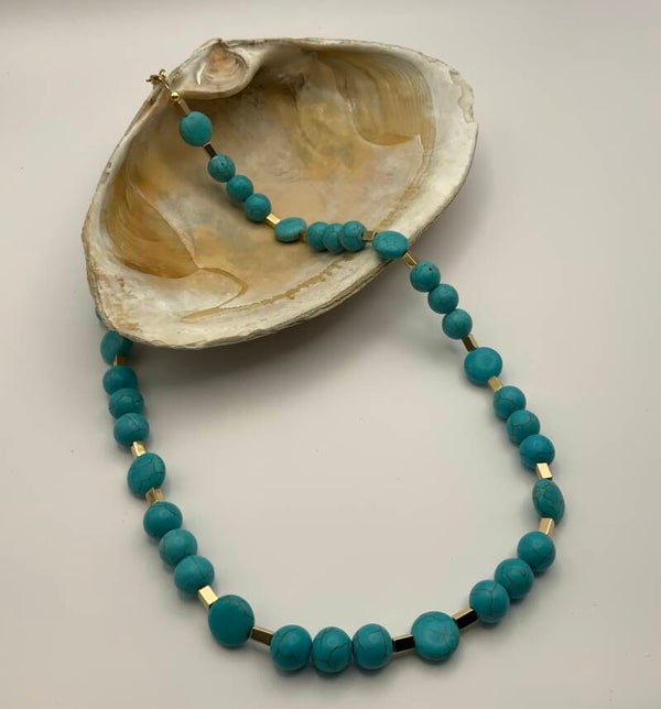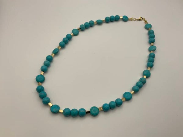 This beautiful tourquoise and gold necklace measures 20". It closes with a lobster claw clasp. This stunner can be dressed up or down. Makes a great gift for yourself or a loved one.