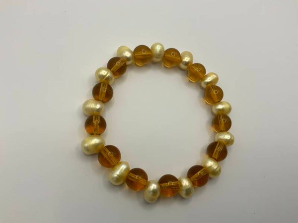This natural Pearl and amber colored glass bracelet reminds me of my findings as I walk along the beaches of Cape Cod. This stretch bracelet is for a size 6" wrist.