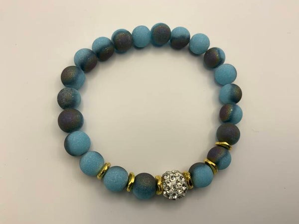 This multi blue stone bracelet with gold spacers and center rhinestone will look stunning when your dressed up or down. It's just the right touch for any outfit. This stretch bracelet is for a size 6 1/2" wrist.