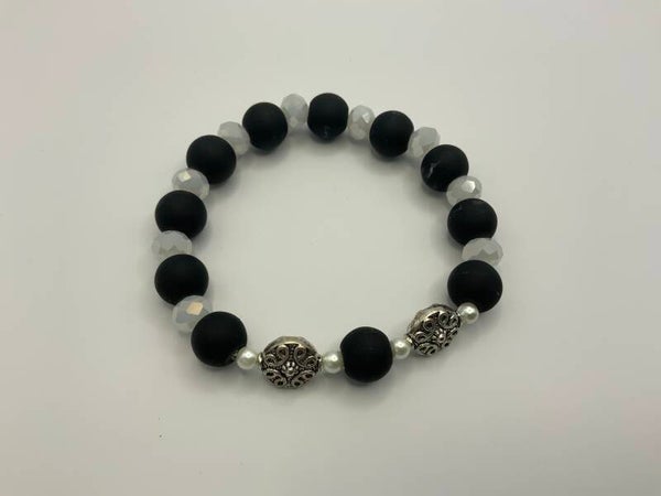 I made this bracelet as I was thinking of our old piano. I chose black and white beads with a center featuring some antigue silver spacers. This bracelet will look great with that little black dress you'll pull out for the holiday gatherings. This stretch bracelet is for a size 6 1/2" wrist.