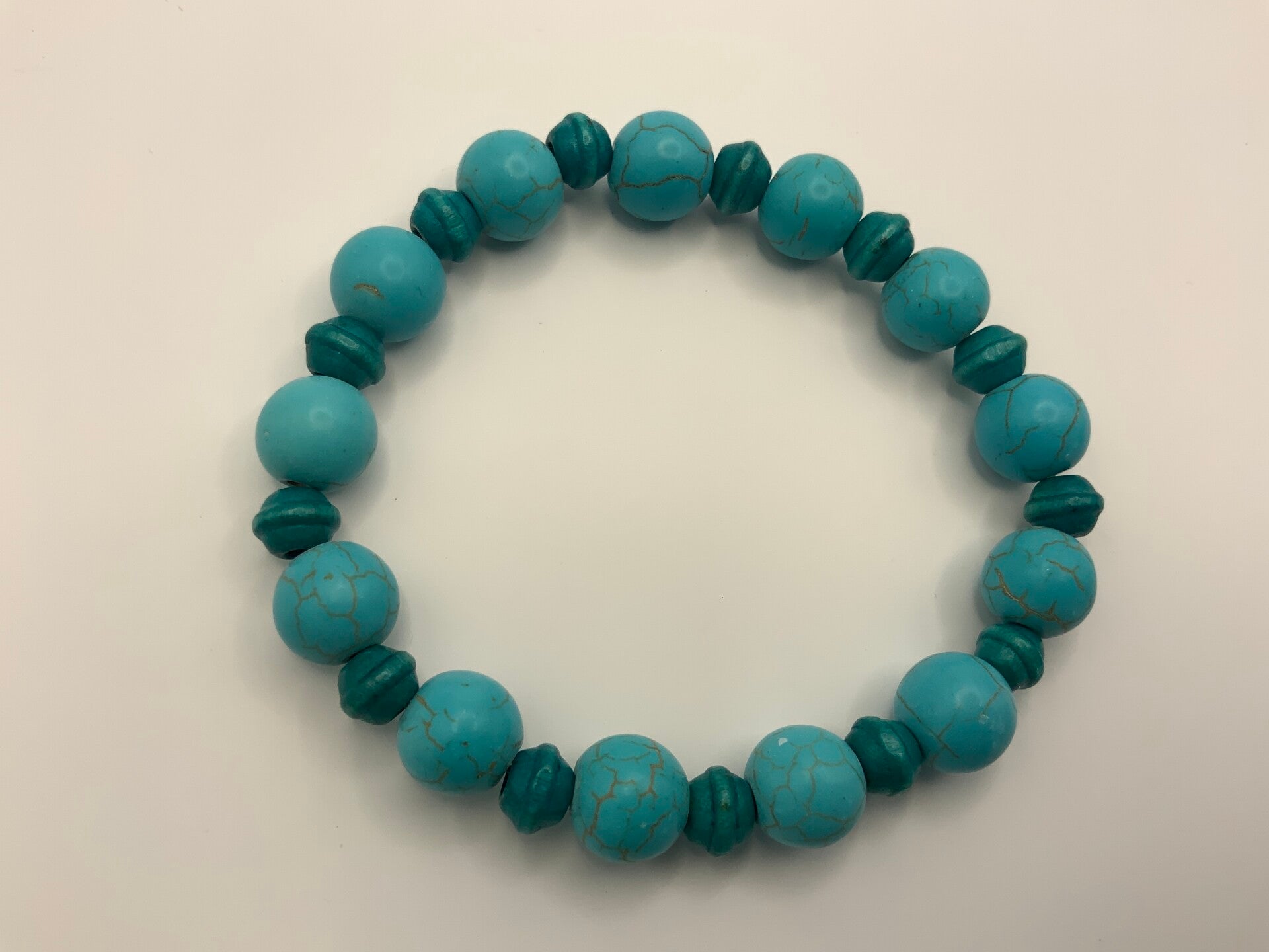 This beautifully colored bracelet is for the Tourquoise colored lover in all of us. The bead features gold veining throughout each bead. This stretch bracelet is for a size 6 1/2" wrist.