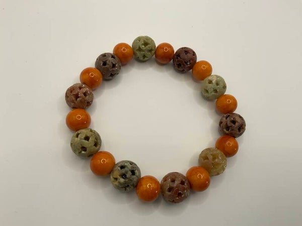 This natural stone and orange glass beaded bracelet will look great any time of year. This stretch bracelet was made for a size 7 1/2" wrist.