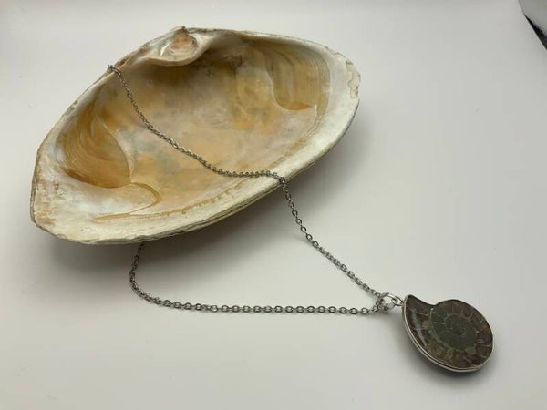 This beautiful greenish/brown seashell has been wrapped and hangs from an 18" stainless steel chain. The lobster claw closure finishes the piece. The seashell is natural on one side and finished on the other side..