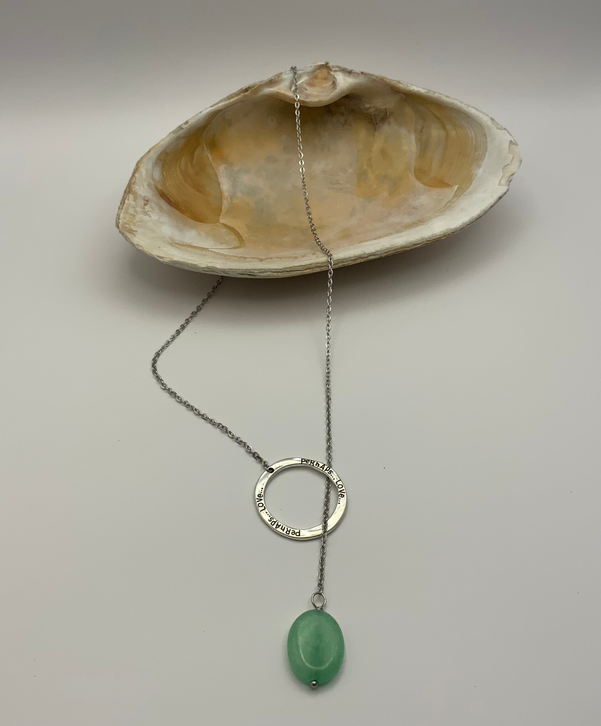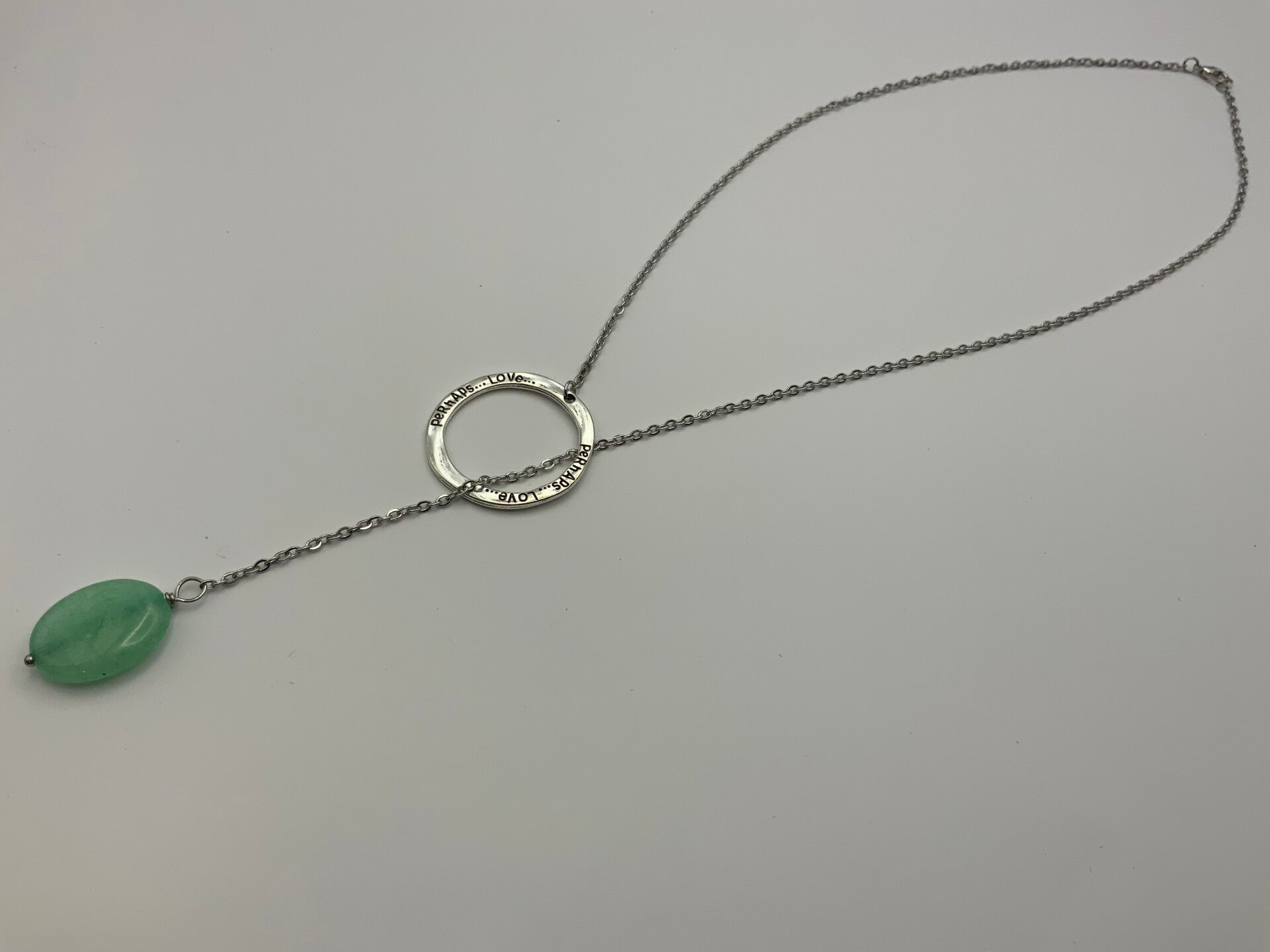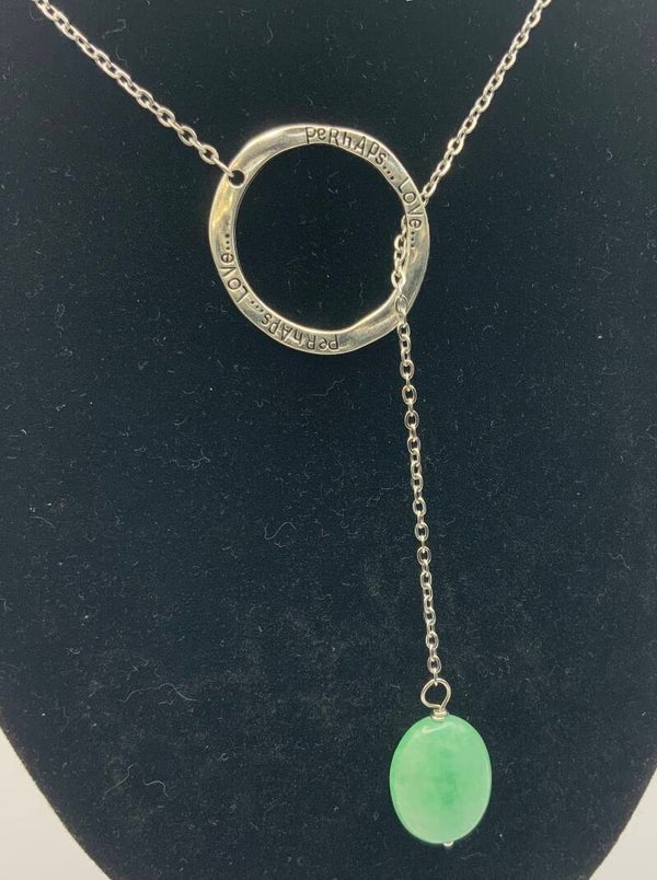 This beautiful 20" lariat necklace is made with 100% surgical stainless steel. The round loop has the engraved words Perhaps Love on it. A beautiful light green pennant hangs from the chain giving it just the right amount of bling. The necklace has a lobster claw closure but you can also put it on by putting it around your neck and dropping the pennant through the engraved hoop. For those with arthritic hands or mobility problems this works perfectly.
