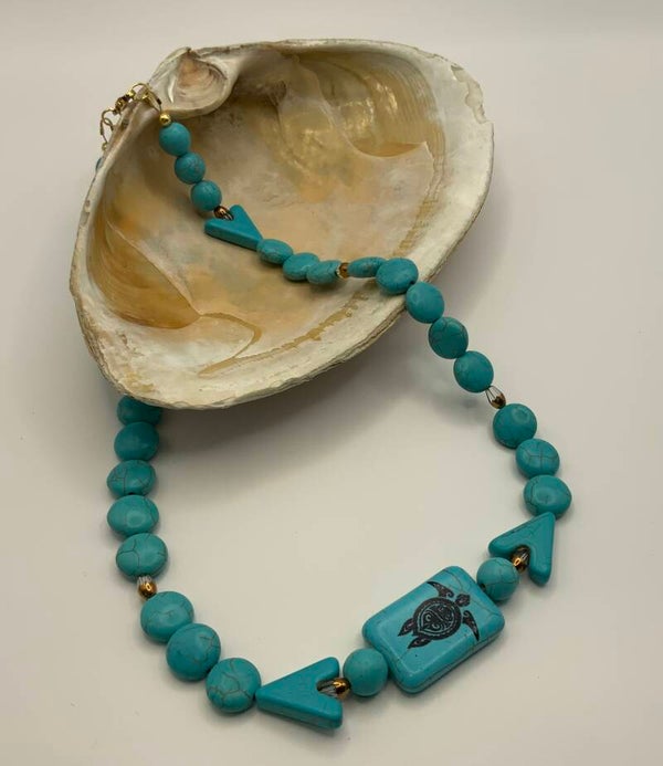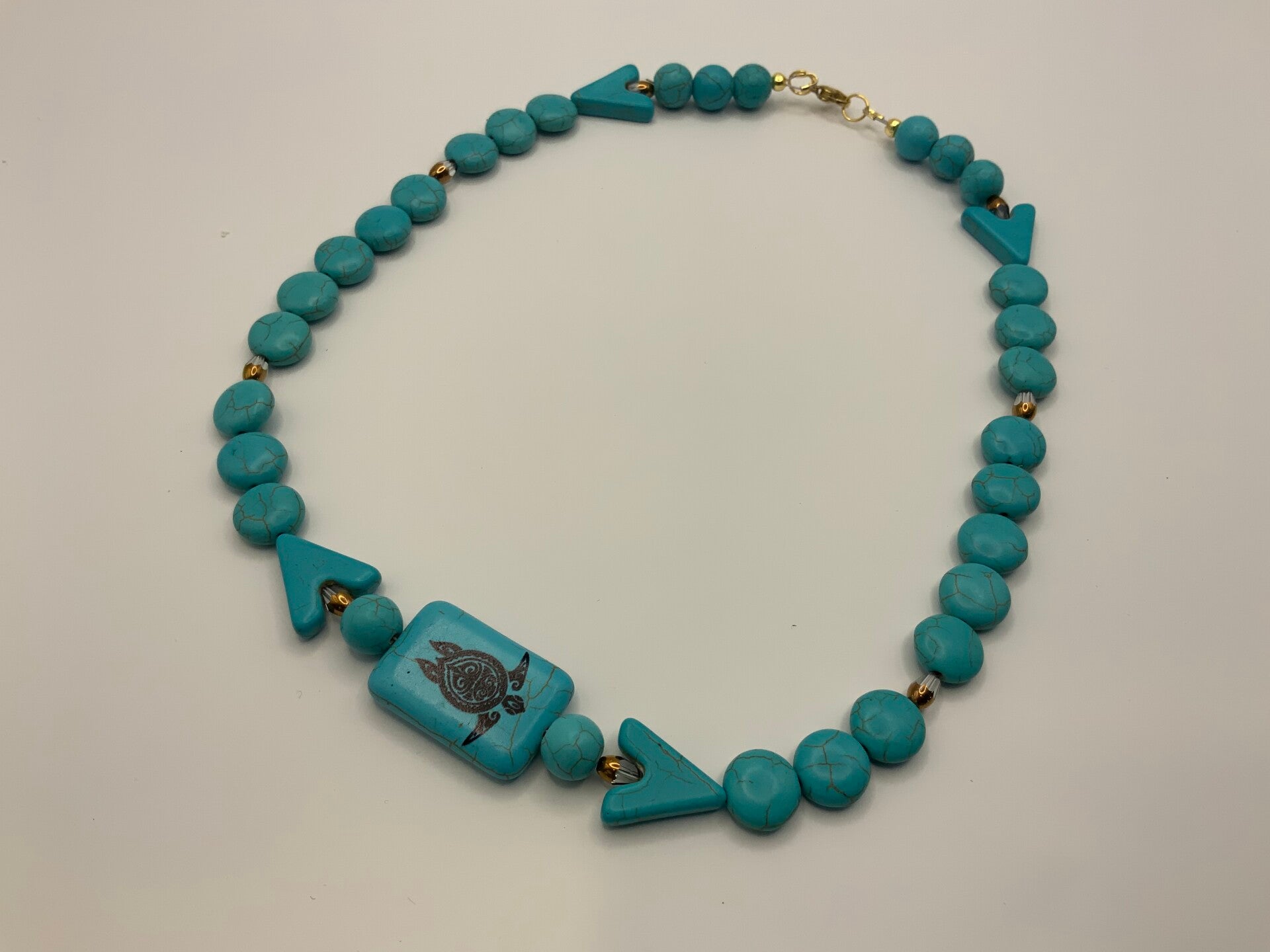 This beautiful Howlite stone necklace is complimented with a single Howlite turtle bead flanked by copper glass beads and Howlite arrows. Match it with our Howlite bracelet and make a set. This necklace measures 18".