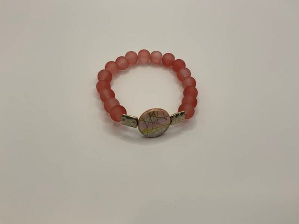 This beautiful coral beaded bracelet features a centerpiece medallion of pink and gold. The centerpiece is flanked by 2 antiqued hammered beads. This is for a size 7 wrist.