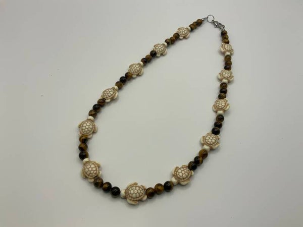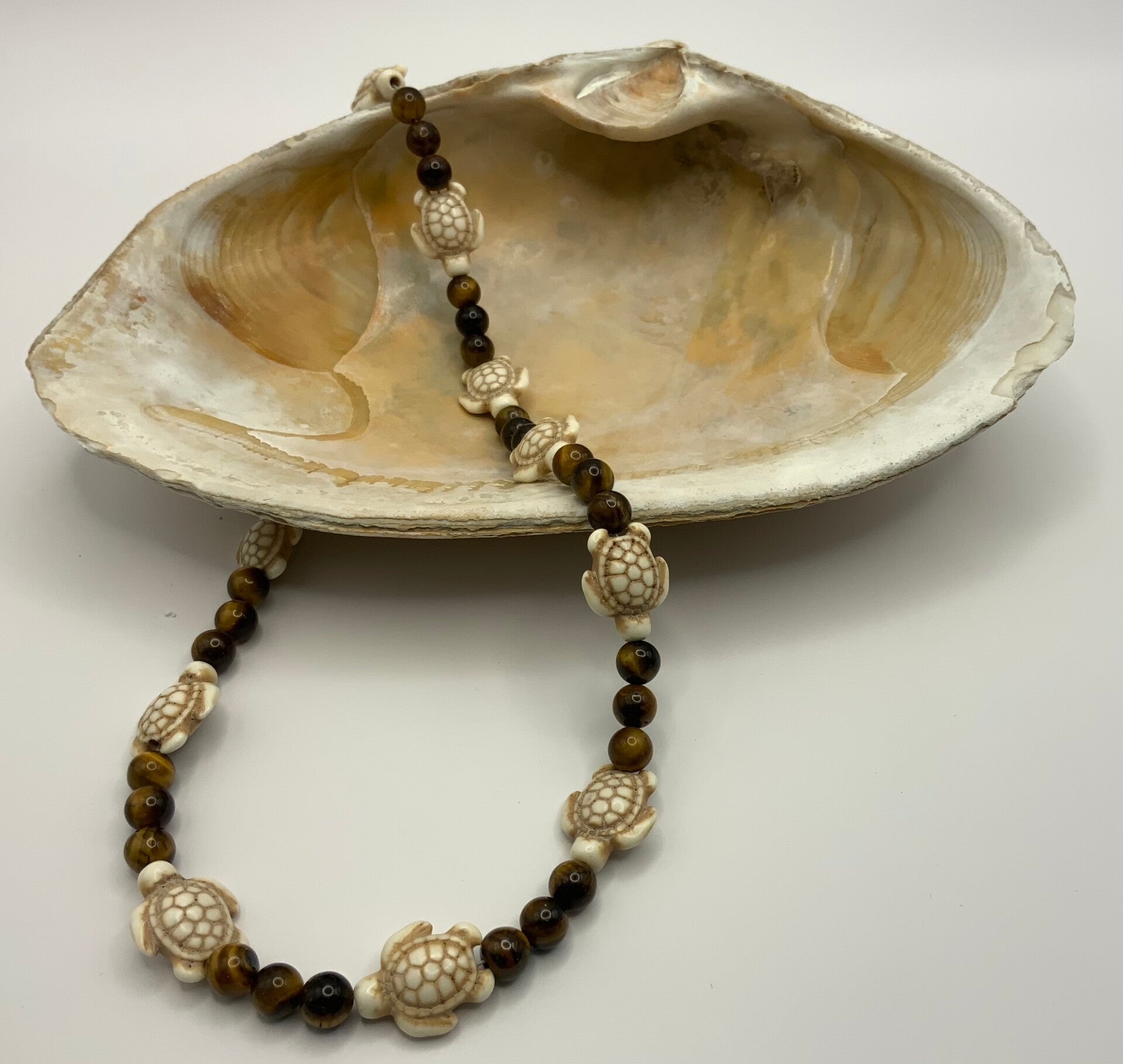 This antique turtle necklace is complimented with genuine tigers eye beads as spacers. It closes with a lobster claw clasp. The necklace measures 16".